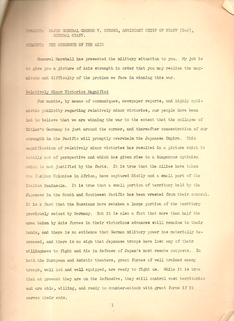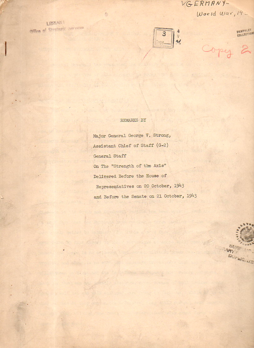 - Major General George V. Strong, The Strength of the Axis", delivered before the House of Representatives on 20 October 1943 and before the Senate on 21 October 1943. 12x9", 13 leaves text and 17 leaves of graphic displays of data. Offset. Bound by a single staple at upper left corner.