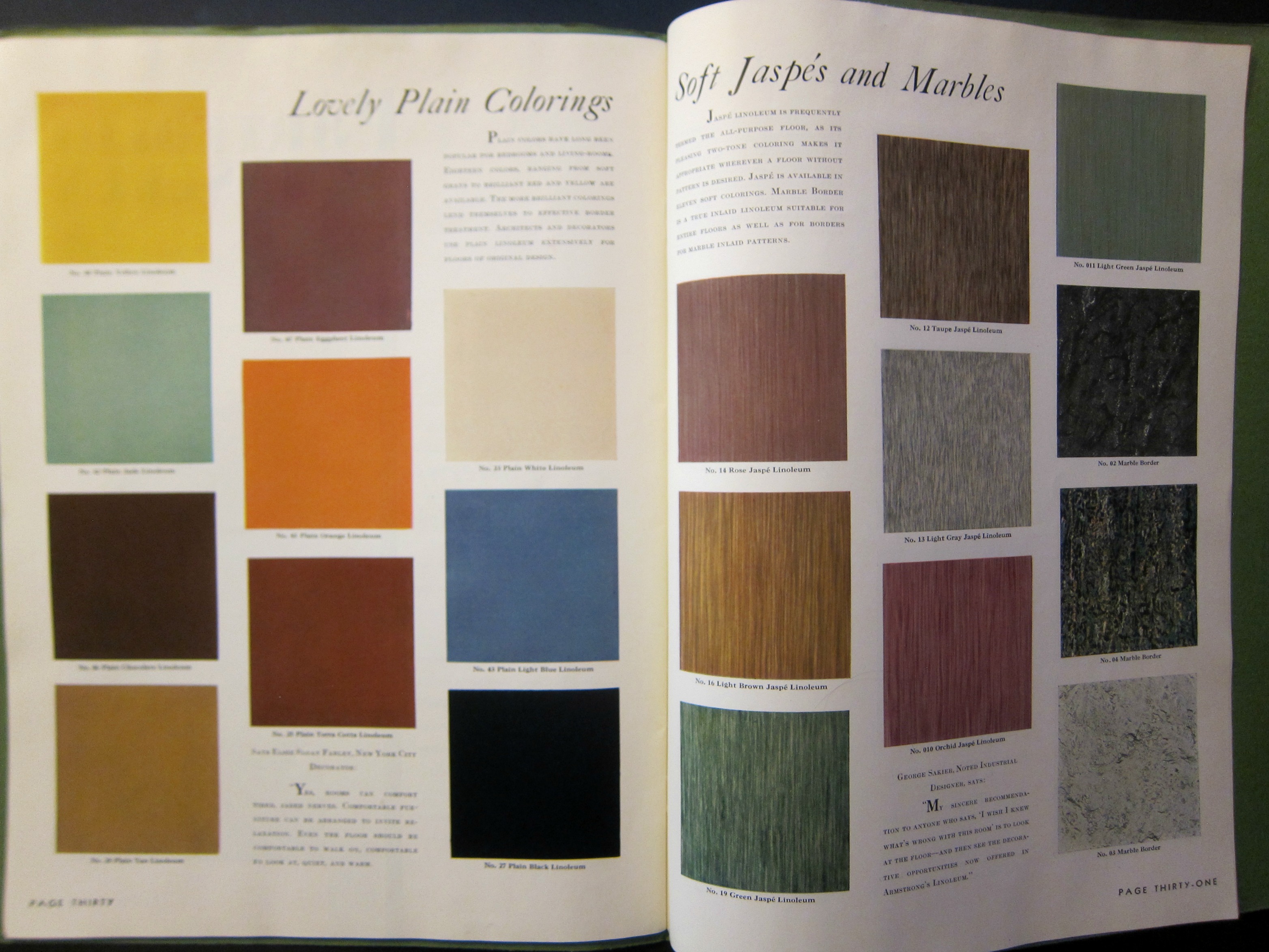 Armstrong Cork Company, Floor Division, Lancaster, PA., 1931. 11.75x9", 36pp, illustrated throughout with color and bw images, and printed on a heavier, semi-glossy paper. Bound in nicely decorated Art Deco wrappers. Provenance: Library of Congress, though the only evidence of that is the LC surplus/duplicate stamp on the rear of the front cover. Very Good copy. $100