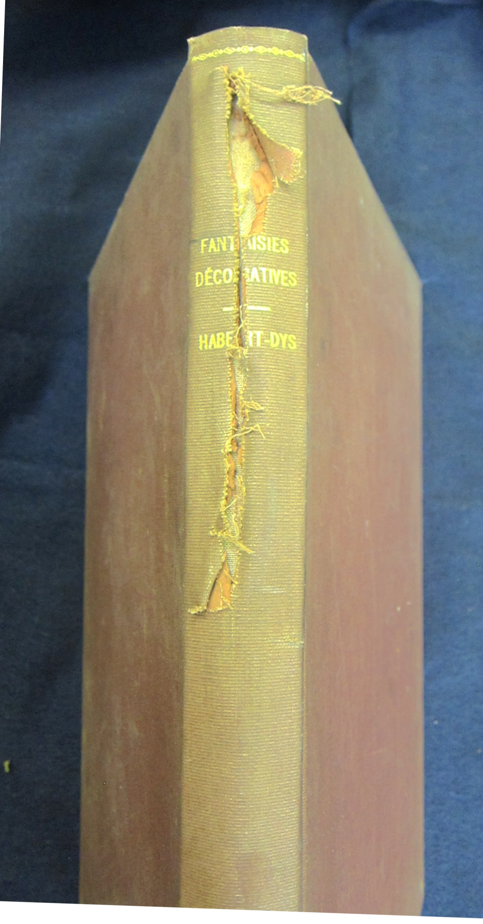 HABERT-DYS, J[ULES-AUGUSTE] - Fantaisies Decoratives. Documents pour servir a la decoration des Faiences, Meubles, Tissus, Bijoux, appartements, etc. .... Quarante-huit planches renfermant environ deux cents motifs. Paris, Librairie de l'Art, n.d. [1887-8] . 48 superb chromolithograph plates by Gillot, greatly influenced by the Japanese style and in a very accomplished art nouveau air, all heightened with gold, on cream paper, mounted on heavy white paper. Folio, (4) pages, title and list of plates.