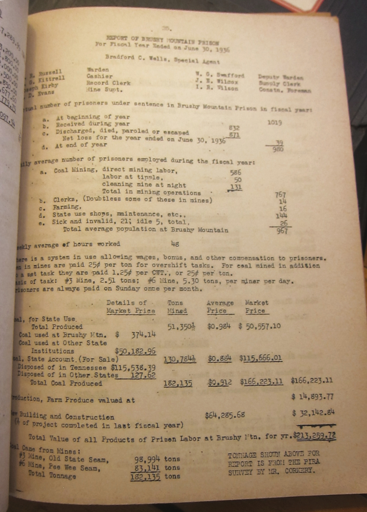 There's a lot of interesting stuff in here: for example, a cursory look reveals that of the 980 inmates at the Bruahy Mountain Prison 967 of them were at work with a weekly average of 48 hours. Here's where they worked: 767 in a coal mine in a coal mine (586 “direct coal mining”, 50 at the tipple, and 131 cleaning the mines at night); clerks , 14; farming, 16; state use in maintenance, 144.