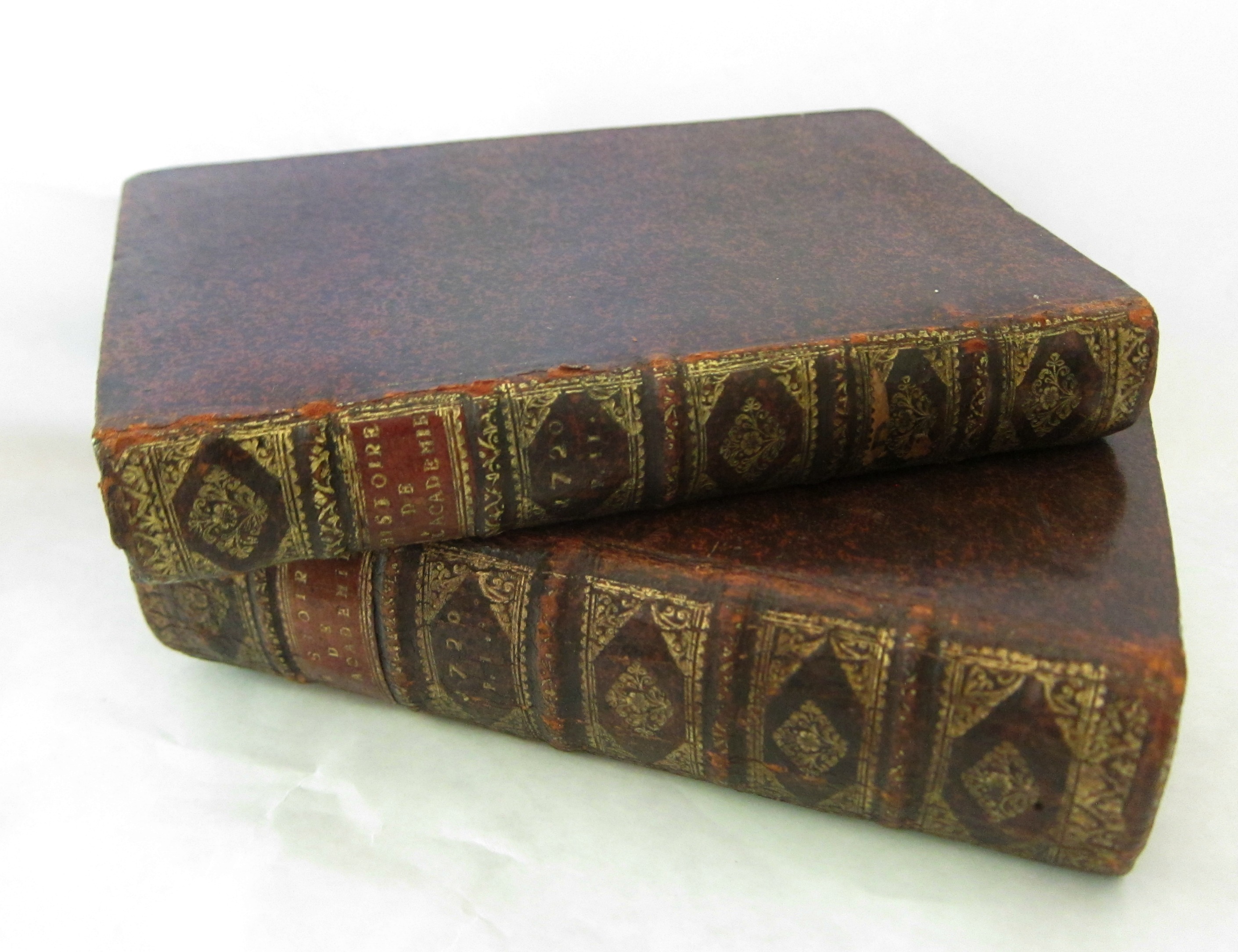 Histoire de l'Academie Royale des Sciences, Annee MDDCXX, avec les Memoires de Mathematique et de Physique pour la meme Annee, Tirez des Registres de cette Academie. Amsterdam, Pierre de Coup, 1724. Two volumes, volume I: (viii), 175, 354pp, plates 1-8; volume II pp 357-604, plates 9-15. 16.5x9.5cm. Very nicely bound in full leather, with decorated six decorated spine panels.