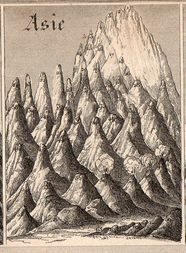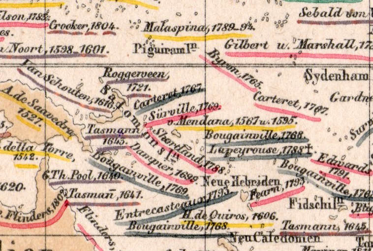 The original map is titled "Plate 3--Shewing the Distribution of the Different Kinds of Coral Reefs, together with the Position of Active Volcanoes in the Map" and was engraved by J. & C Walker, and printed by Smith & Elder. The Annalen map measures 19x28cm and has no title or indication of engraver.
