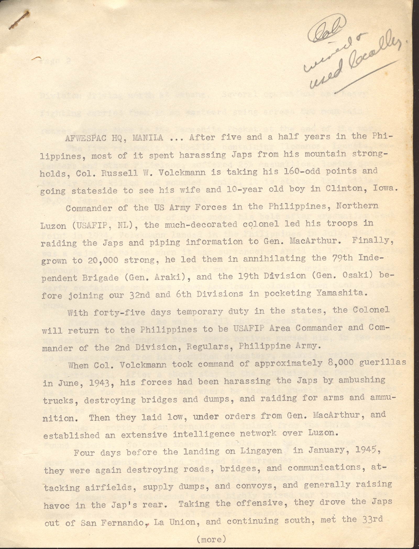 The first document relates the extraordinary story of Col. Russell W. Volckmann who from 1942 led a force of thousands of guerrillas against the Japanese and who, by September 1945, led a force of 20,000 in routing the last elements of the Japanese army. (The entire text of his memoir written in 1954 as We Remained Behind: Three Years Behind the Enemy Lines in the Philippines can be found here.)