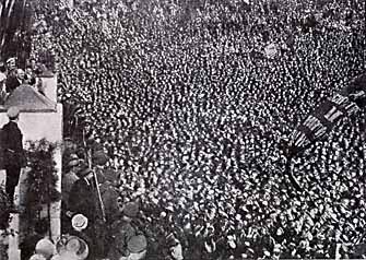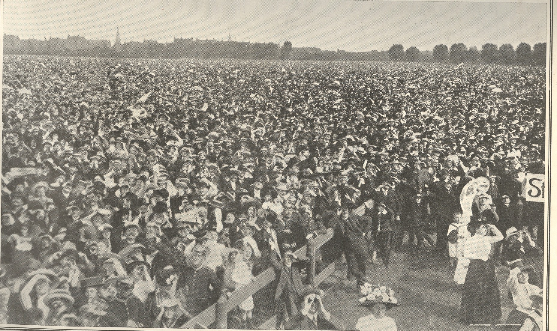 Perhaps a similar sized crowd (some estimates putting the number at a million) showed up to listen to Bruce Springsteen perform in East Berlin in 1988. I have no idea what the East German government was thinking when they allowed him to perform. Listening to hundreds of thousands of people singing along to "Born in the USA" is monumental and very emotional--the video stays like that the whole way through, but the crowd really seems to find its voice at 2:52. Both scenes are pretty ecstatic, all those people seeing something that they'd never seen before... I guess it woul dbe possible for someone to have been in both crowds in their lives--a little tottering, and watching at the fringes of a brittle-bone-cracking crowd, but certainly possible. (And definitely possible for certain enhanced crowds in that same city in the 1930's, but I won't go there.) Somehow I've got a connection going between the kid in the 1909 scene and the kid in the Springsteen video at 5:02
