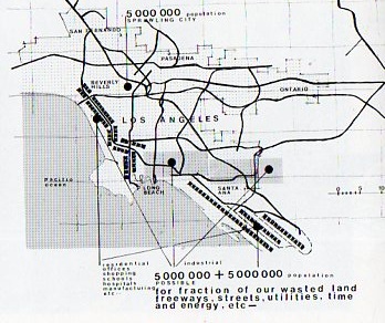 The Romanian architect Harlan Georgesco came up with an idea to prevent suburban sprawl from making one city out of the land from San Diego to San Francsico--put the suburbs in the sky. The story is in the wonderful Unbuilt America by Sky and Stone under the subheading "Relocation of Los Angeles", where they quote Mr. Georgesco saying that the sprawl of a plan to develop 300x300 foot "horizontal plots" in a larger scheme of an endless horizon of such housing could be made into "vertical tracts".