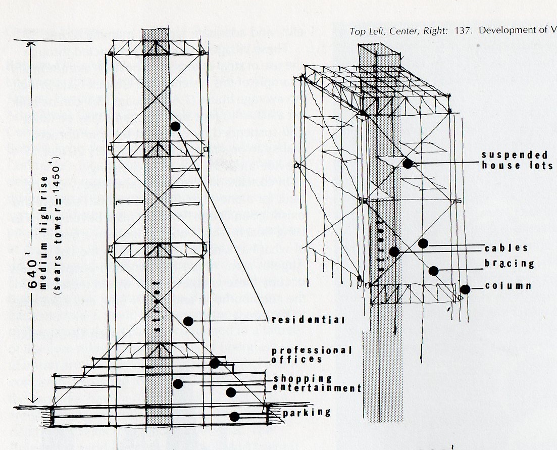 The vertical tracts of 300x300 feet (90,000 square feet or about two acres) oe chunks thereof would be suspended via "steel in tension" (giving the Golden Gate Bridge as an example of this system) in a structure 640 feet tall, which is labeled as a "medium high rise"). (I should point out that the WTC was 208' square.)