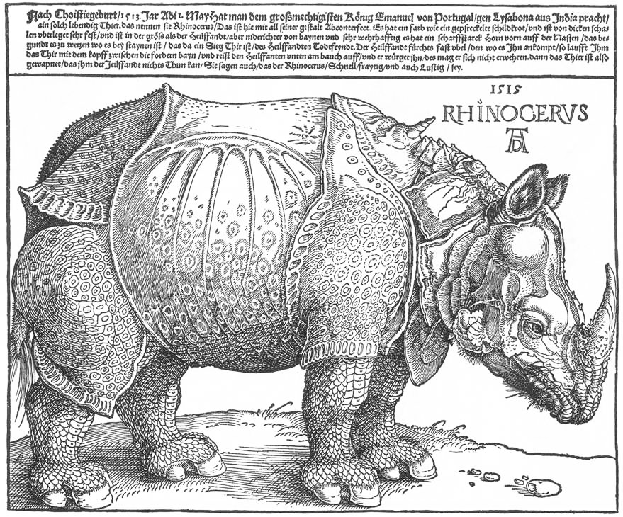 Albrecht Durer does manage to come into play here, if not for some of his trees or the bits of string that he renders holding other bits aloft, but for his famous if not-terribly-original rhinoceros, which he had never seen though which he had seen images of, and for which he had taken the trouble to include the beast's chin hairs: