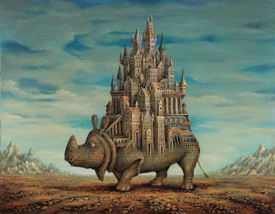 I just wanted to share in this very quick posting the extraordinary work of the Russian artist Sergy Tyukanov (b.1955), who paints/etches/draws fantastic images calling freely on legendary literature, folktales, history, philosophy, as well as the work of some earlier masters (as in the Bruegels and Bosch, seen in the last two images). If you follow the link to his website you'll find that some of these images--which in their nature seem to be telling you that they are enormous works--are actually very small, on the order of one square foot. Fabulist artists like this, especially those anthropomorphizing their subjects, have always been of great interest to me. ANd I've got to say that Tyukanov's architecturals remind me very strongly of ideas in the 18th century French visionary architects like Lequeu and Boullee and Ledoux.