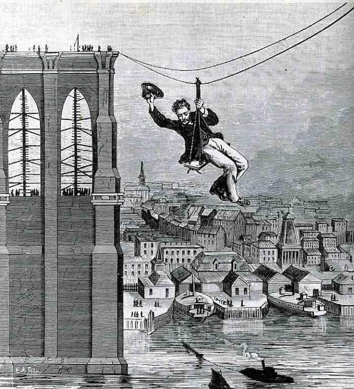 of the half-completed* Brooklyn Bridge, showing master mechanic and chief engineer of the project E.F. (Frank) Farrington making his slidy way as the first person to cross between the two spans (on 26 August 1876).