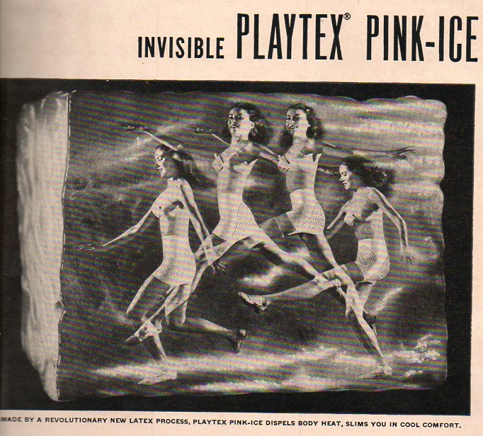 The idea of these ads seem horribly revolutionary: on the one hand, the badly-named and hyphenated Playtex product "Pink-Ice" squeezed women into new tight but malleable molds, while at the same time promised some sort of ballet-like freedom because of it. Like the creeping ("two steps forward and one step back") communism of the time, Playtex promised the possibilities of enhanced freedom through restrictive clothing (in a "peace through strength" vision). In any event, and in spite all of what I just wrote, the pictures are kind of amazing.