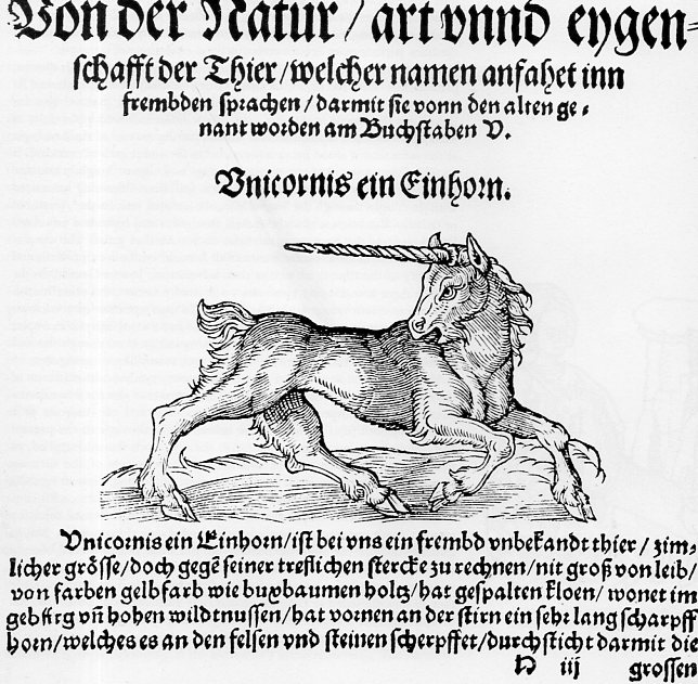 This fabulous image of a unicorn, draped in Renaissance-y literary moudlings appears in The secrets of Albertus Magnus: of the vertues of herbs, stones, and certain beasts : whereunto is newly added, a short discourse of the seven planets, governing the nativities of children : also a book of the same author, of the marvellous things of the world and of certain things, caused of certain beasts being a translation of De virtutibus herbarum, lapidum, & animalium quorandam libellus, and his De mirabilibus mundi, ac de quibusdam effectibus causatis à quibusdam animalibus (1543).