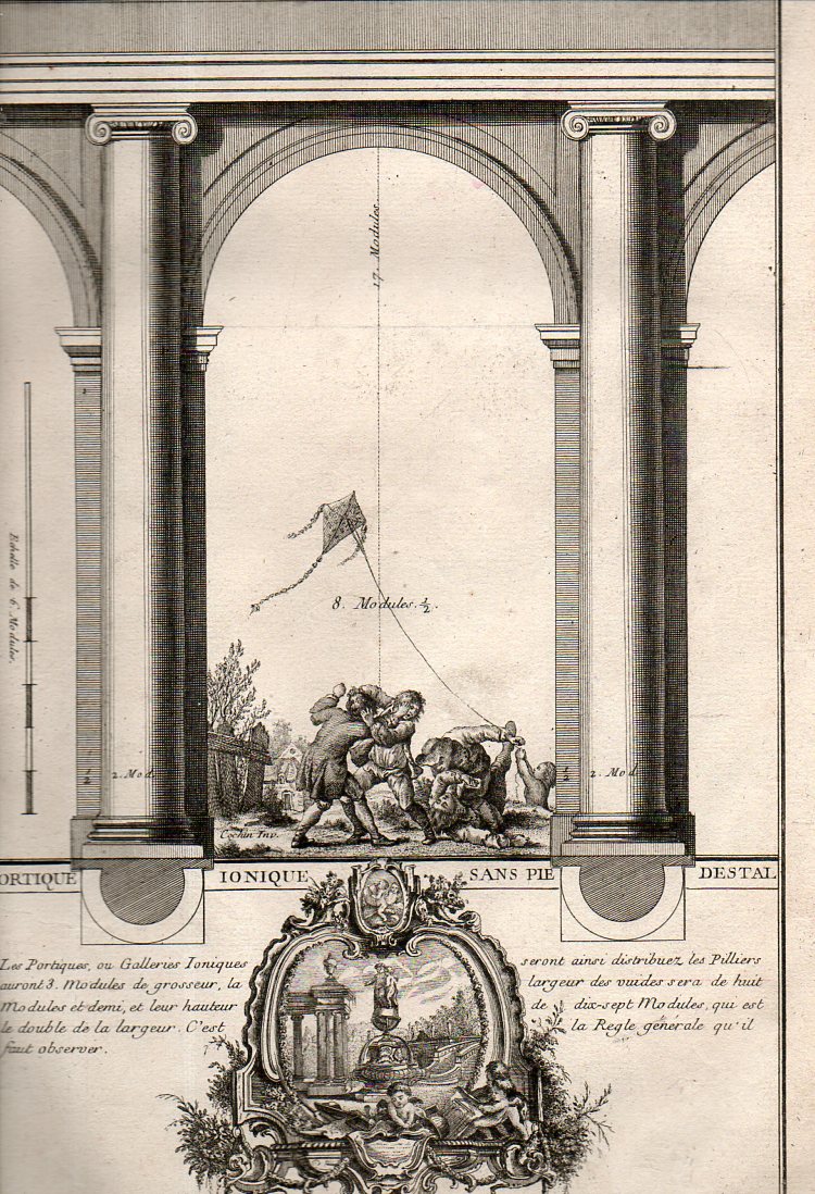 This Rococo edition of Vignola [Jacopo (Giacomo) Barozzi da Vignola (Italian, Vignola 1507–1573 Rome)] features fabulous interpretations of the classic textbook, the images of columns and plans of buildings and designs of rooms and so on all are decorated with bits and pieces of 18th century humanism. The detail above (with the nearly-full engraving below) is embellished with a very uncommon scene of children fighting and playing. It is one of many that are illustrated with scenes of everyday life which really have nothing to do with the image in which they find themselves, a little bit of When Worlds Collide happiness.