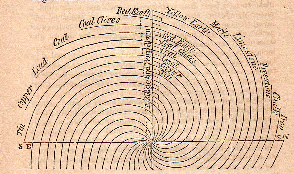 This simple theoretical map is an invented scheme of John Strachey (1671-1743), an early geologist who with this thinking introduced the very big geological idea of strata. The original appeared in the Philosophical Transactions in 1725 (full text here, and another, with a more-realized version of representing strata, is here), and was reprinted I believe in Popular Science Monthly in 1869 with the above illustration (somewhat changed from the original). My interest in the image is tinged with design, as it reminds me of an enromous subterranean tornado of coal, even though what Strachey is doing here is establishing the idea of strata.