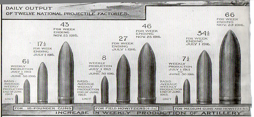 I don't often see graphical displays of quantitative data utilizing quite so many images of shells, even when the image is comparing ammunition production. This striking example is found in The Illustrated London News for July 15, 1917.