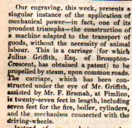 1. "To Julius Griffith, of Brompton Crescent, in the county of Middlesex, Esq. for certain improvement in steam-carriages, and which steam-carriages are capable of transporting merchandise of all kinds as well as passengers upon common roads without the aid of horses being communications by foreigners and discoveries by himself.'