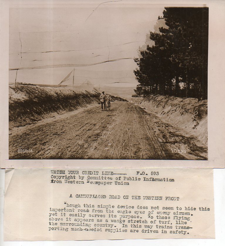 This wonderful, contemplative, lonely, sad, and ultimately draining photograph depicts a camouflaged road somewhere on the Western Front. That's rather a prosaic term for that atrocious line of battle that stretched from the North Sea to Switzerland, where hundreds/thousands of miles of trenches were dug and filled and fought over, where millions of shells were shot and exploded, and millions of soldiers and civilians killed and wounded.