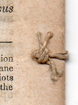 I'm including an unlikely image from my copy--the bit of string and the knot that held the pages of this document together. Rather than the stitching normally found in these pamphlets issued by U.S. goverment printers Tippin & Streeper (identified in tiny 3-point print at the bottom of the front page) this one has only a single side-saddled stitch, with a tenuous double knot, holding the sheets of paper together. It was almost as though the thing was constructed for impermanence--it wasn't, of course; it was just bound quickly and with little thought. Somehow it kept itself together.