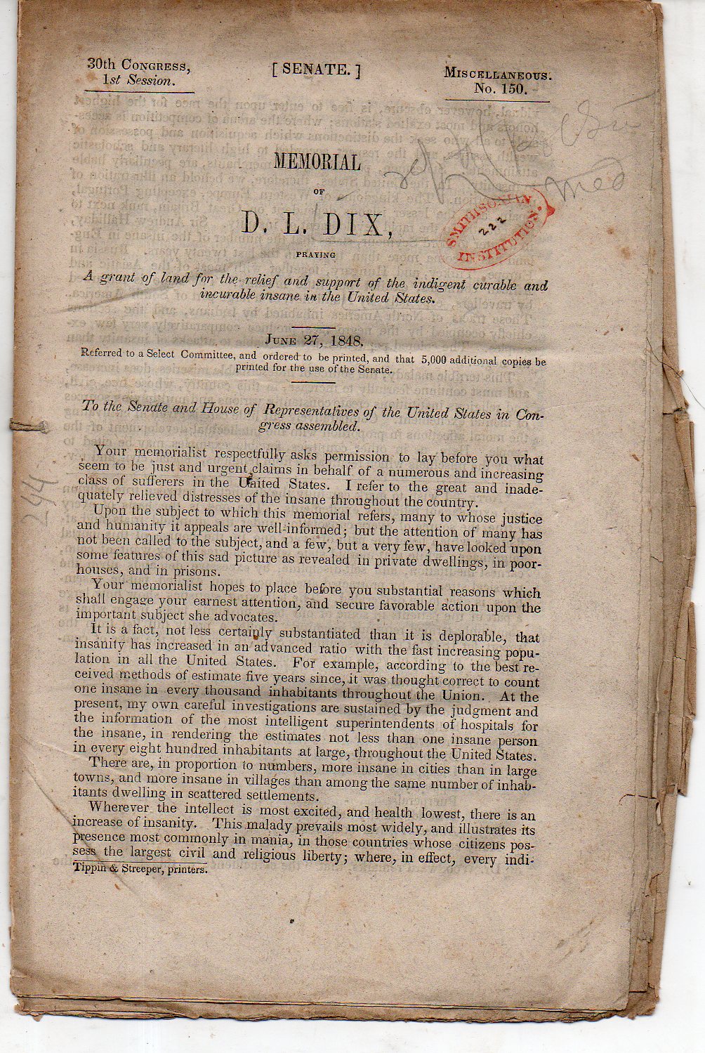 The document: Memorial of D.L. Dix, Praying a grant of land for teh relief and support of the indigent curable and incurable insane in the United States, June 27, 1848, 30th Congress, 1st Session, Miscellaneous Document No. 150, 32pp.