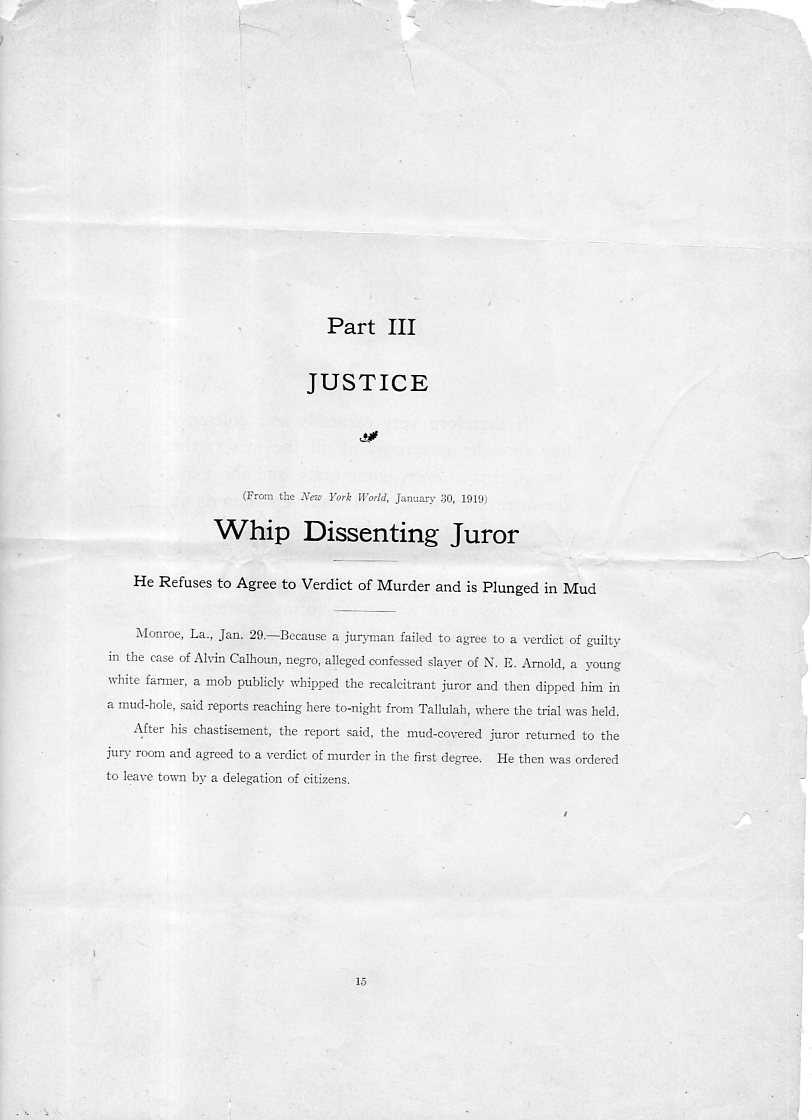 This truly is an appeal "to the world" for there to be an understanding about what was happening to African Americans in the United States in 1920--and this appeal wasn't about unequal access to education or jobs or Jim Crow laws or any of the social assaults made on those people; it was more basic than that. It was a statement of how thousands of African Americans were being lynched, and murdered, and burned. The appeal was extremely basic--to let it be known that these horrors were being committed against a class of people with little capacity to defend itself legally.