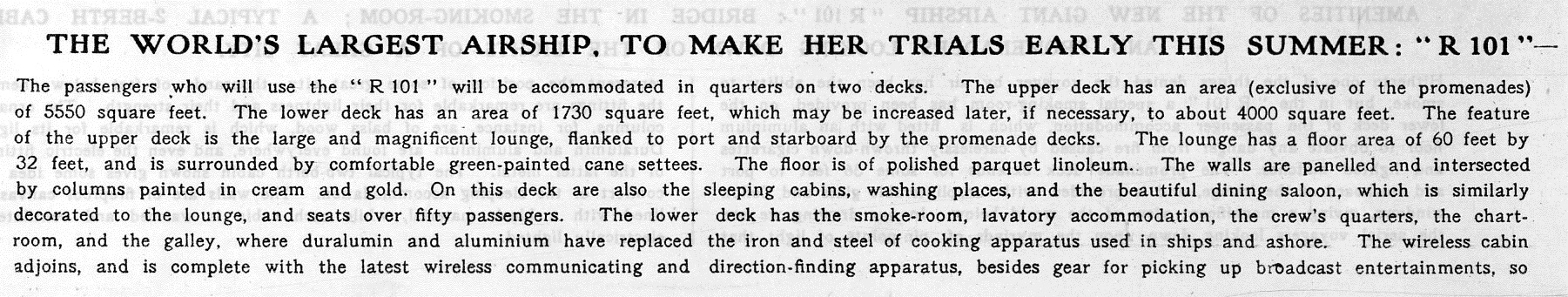 The R 101 was one of the largest lighter-than-air airships ever created. The ship was still about a year away from its maiden flight when this popular survey was published in the Illustrated London News on March 29, 1929--unfortunately this flight would also be its last, finding disaster over France on October 5, 1930. The airship was 777' long, 140' high, and had a volume of about 5 million cubic feet, and operated with a crew of 42--a big object.