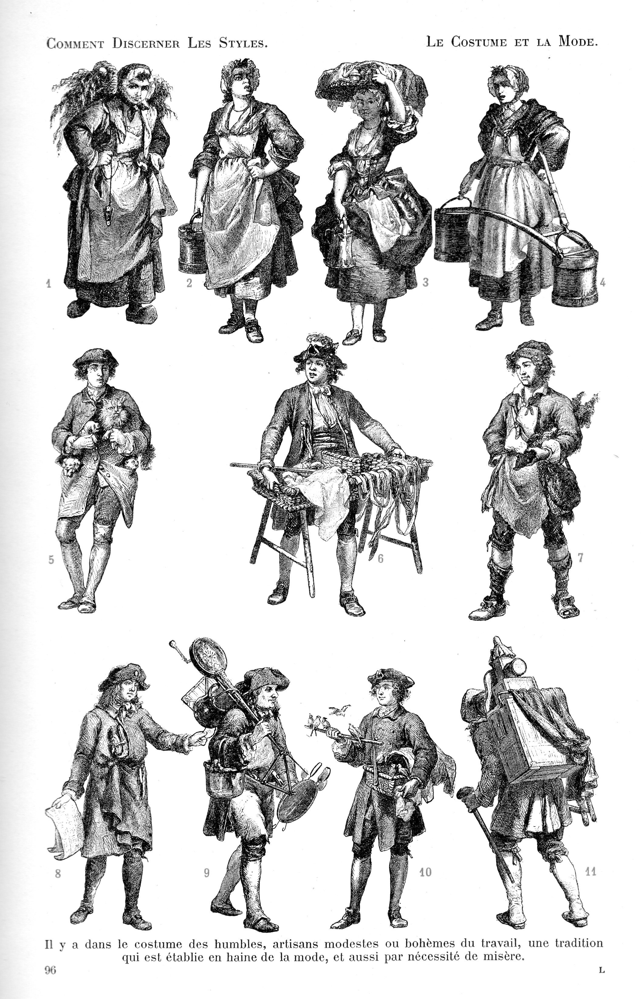 This is a rather poetic approach to describing and naming street vendors during the reign of Louis XVI--of course these sorts of descriptions tend to be so in another language. "La boheme du travail une sorte de tradition de la misere, la defroque prend sur le dos de ces irreguliers du travailuine mem forme et une meme coleur..." is how these images are described by L(eon) Roger-Miles' in Comment Discerner les Styles du VIIIe au XIXe Siecle...etudes sur les formers et les Variations dans le Costume et la Mode, by L(eon) Roger-Miles, volume III, and published in Lyon around 1900. Bohemian workers in a tradition of misery (or thereabouts) is how this is described--common people of a remedial ability, trying to make a penny. Street vendors.