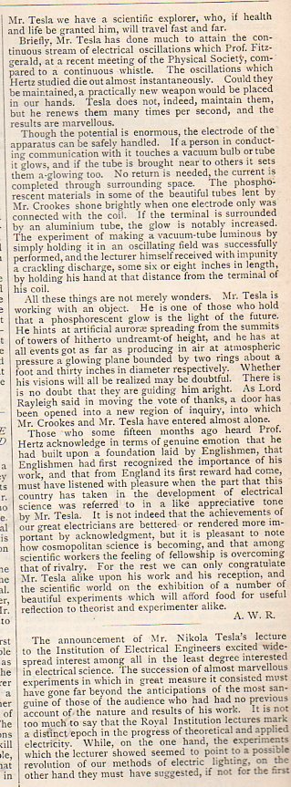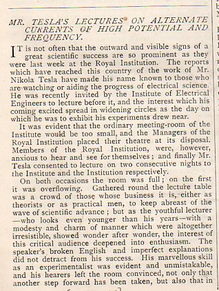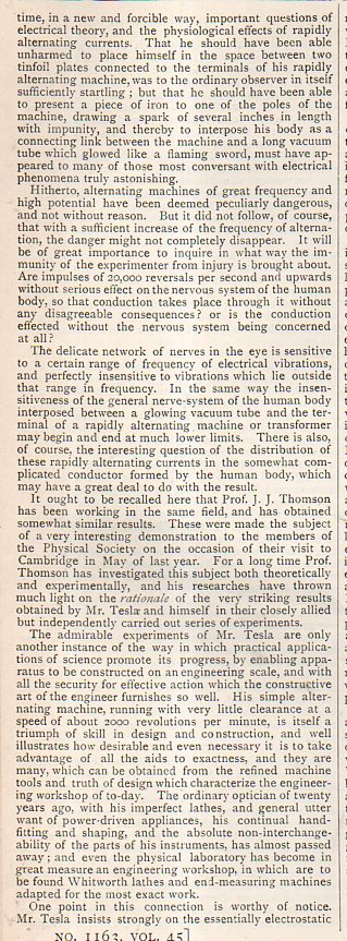 In January 1892, the 34-year-old Nikola Tesla gave an interesting and significant lecture on ("alternate currents of high potential and frequency") in London, first to the Royal Institution and second to the Institution of Electrical Engineers, which was summarized in this short paper in Nature (volume 45, #1163, 1892) reproduced below. This is a continuation it seems of his famous July 1891 lecture in which he first addressed his experiments with alternating current, and which gained him international attention. The full lecture may be seen at the Internet Archive: https://archive.org/details/ExperimentsWithAlternateCurTeslaNikola5098/page/n0
