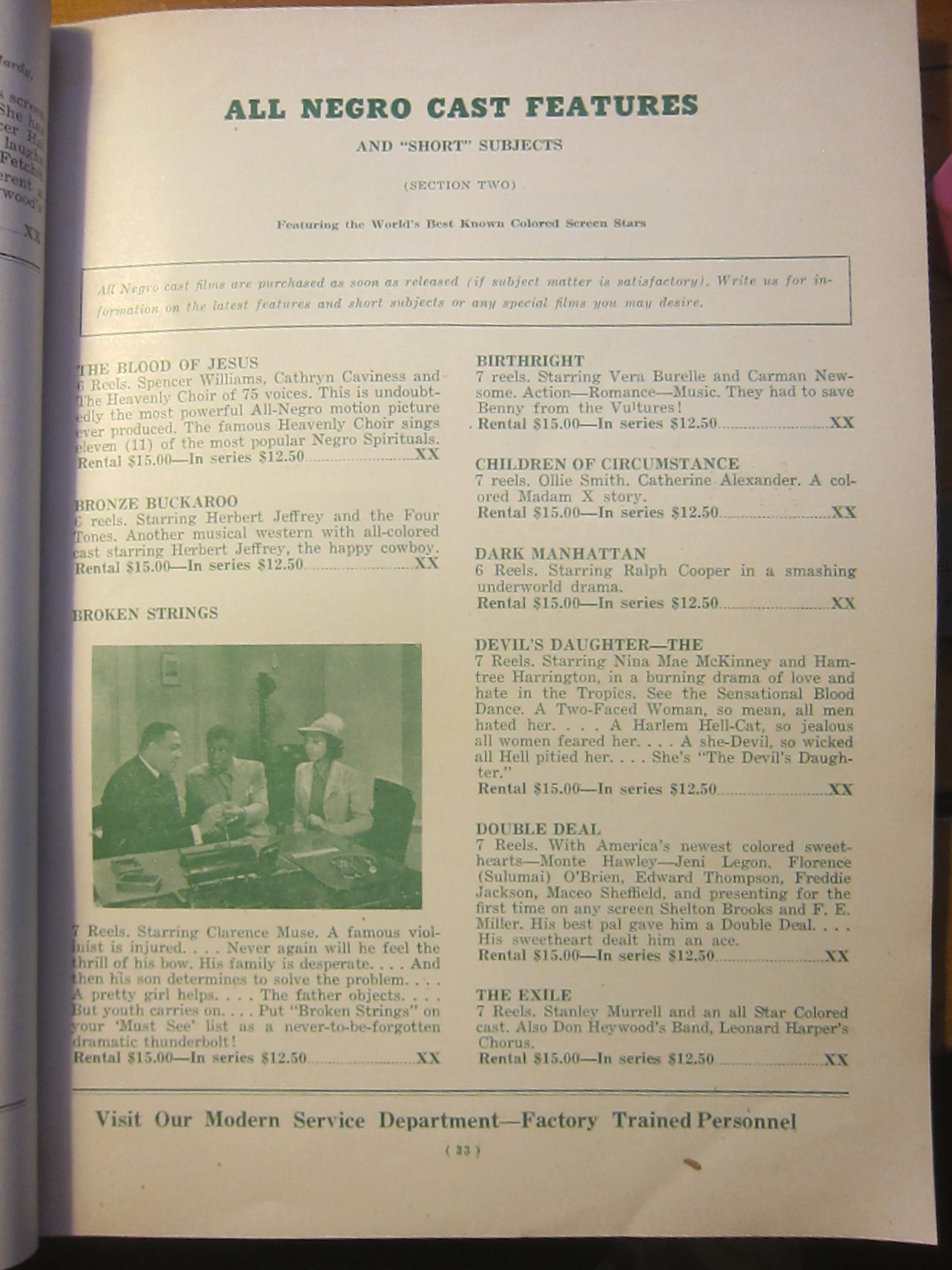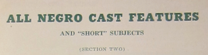 The “All Negro” offerings (no films in the catalog are dated) included 37 features ranging from 1931-1944, with ten in the 1930's and three in the 1940's. Only 12 of these are referenced in full on the Separate Cinema site, with four others tangentially mentioned and dated. There are then two pages of shorter, movies including: Short Subjects (14 films), "1-Reel All-Negro Cast Subjects (16 films), "Features with Prominent Negroes..." (4 films), "Cabin Kid Comedies" (8 1-reel films), "Musicals" (9 1-reel), "Joe Louis Fights" (9 1&2-reel films), and "Spice of Your Program" (3 2-reels).