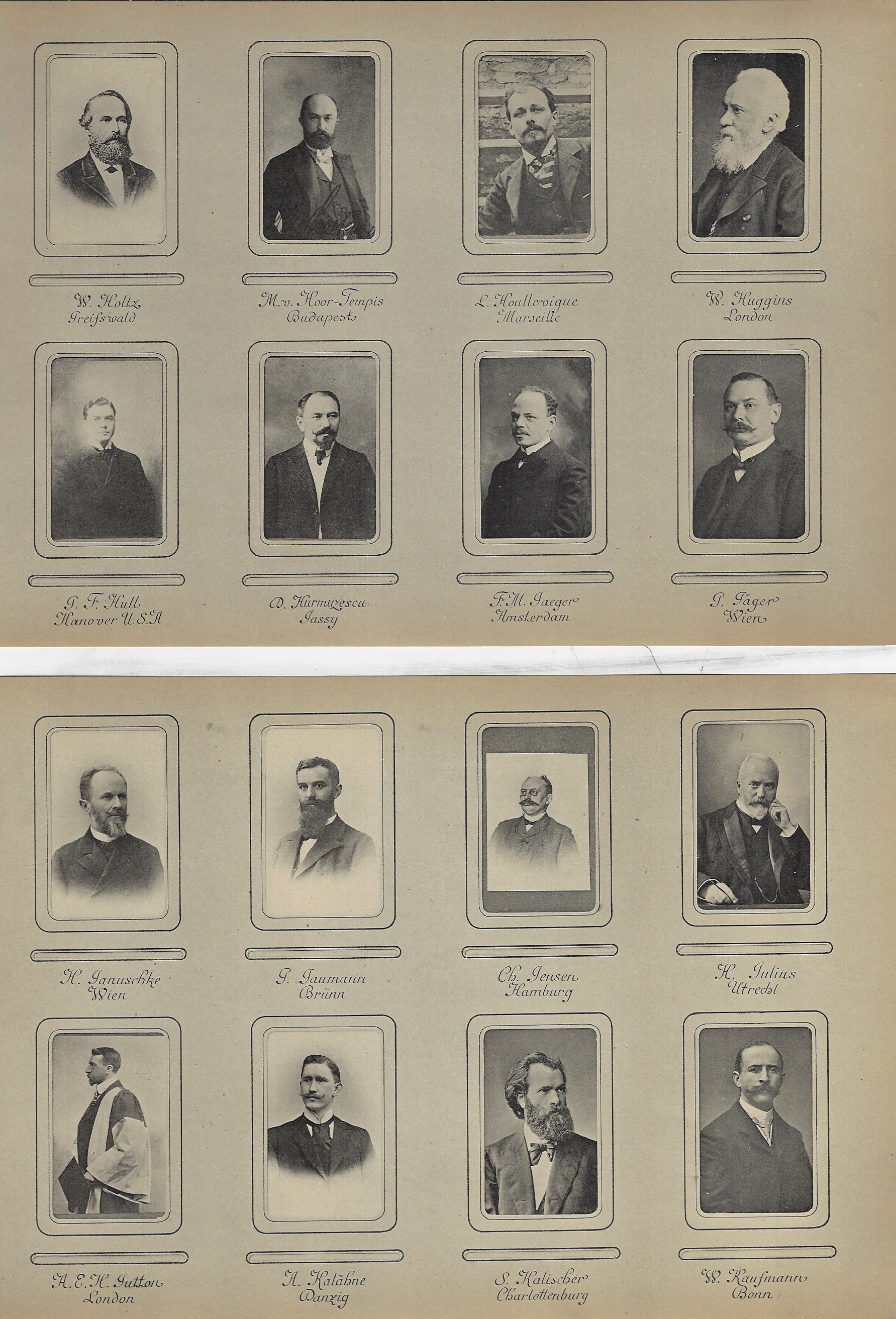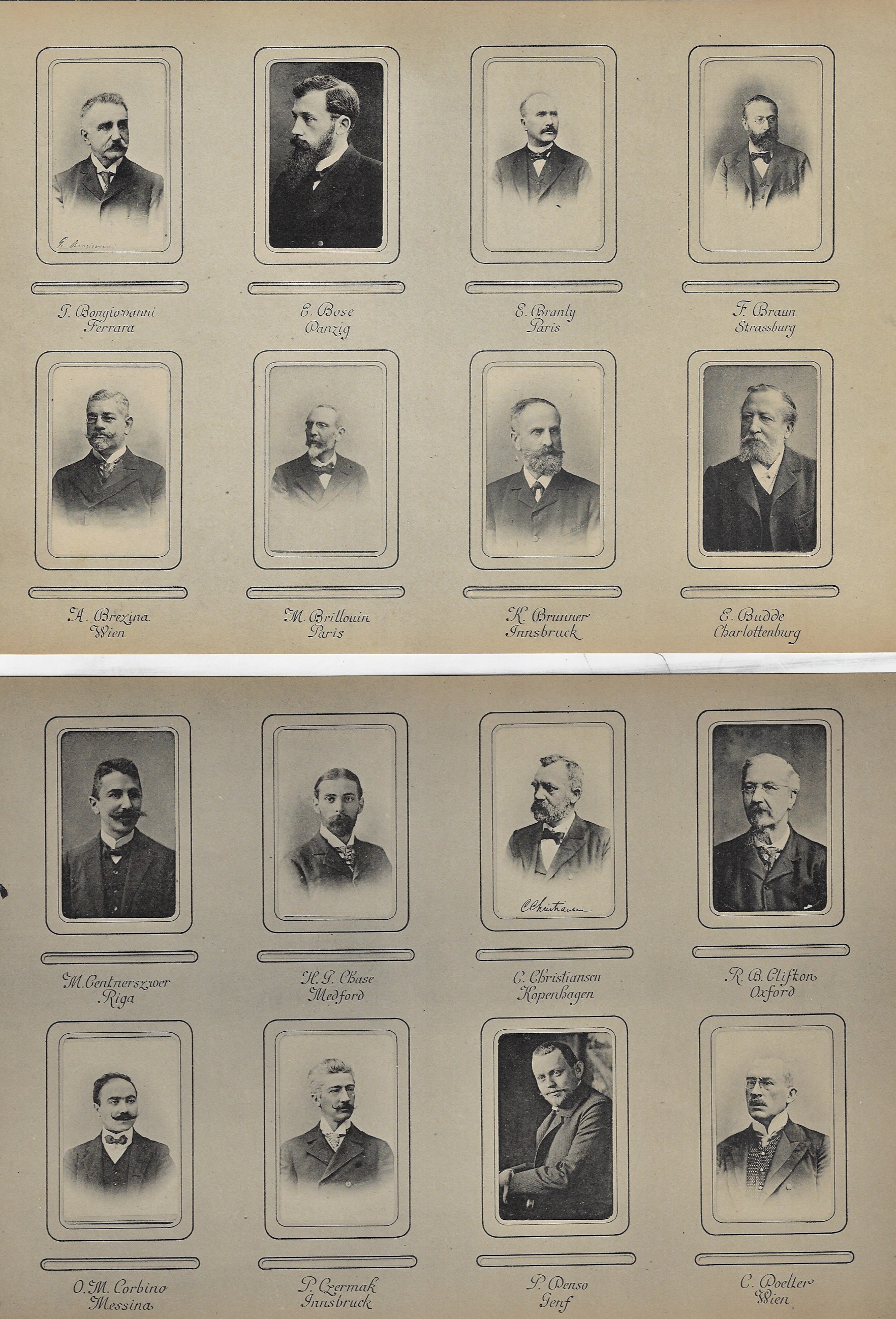 This scarce publication--Bildnisse zeitgennossischer Physiker--is a collection of about 320 portraits of leading physicists, collected together as an homage to Viktor von Lang on the occasion of his 70th birthday. The book was made to look like a family portrait album, resembling stiff cardboard pages that would have open places in the pages for a collection of cartes des visites to be slid into place via at slot at the bottom of the window. The physicist are from Germany, France, the UK, Spain, the U.S., Russia, Czechoslovakia, Poland, Italy, Hungary, Japan, and a few other countries. Interesting to note here are the three portraits of women physicists: Margaret Maltby (Barnard, and first woman to receive a doctorate from a German university); A. Serdobinskaja (St. Petersburg); and O. Steindler (Vienna).