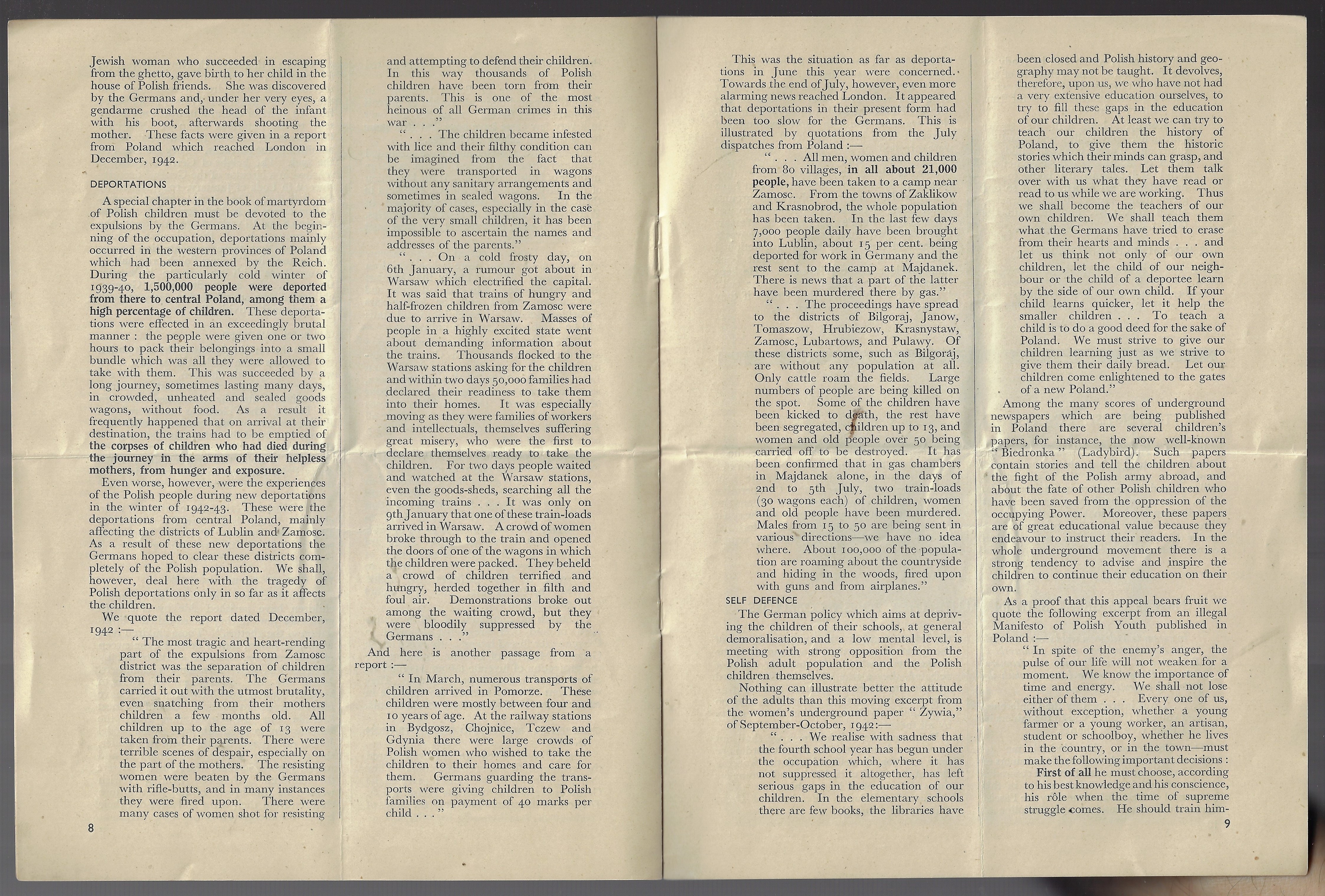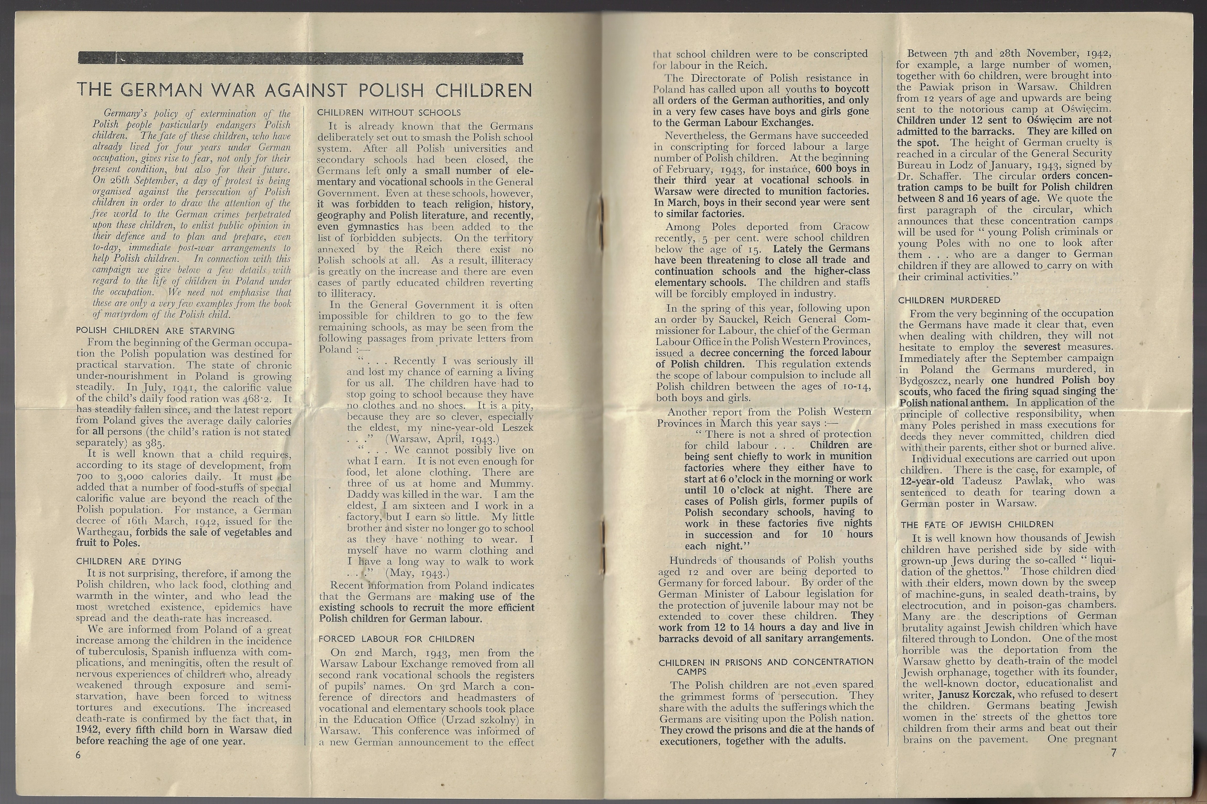 Of particular note here are the four pages devoted to the Nazi/German treatment of children. There are also specific references to the deathcamps/KL Treblinka, Majdanek, and Oswiecim (Auschwitz).