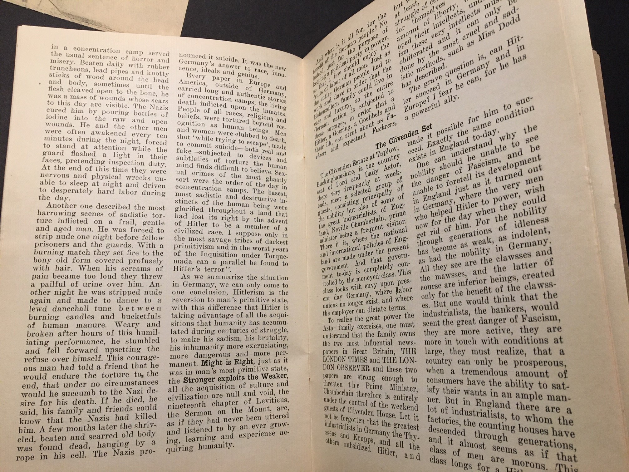 Most of the discussion of the concentration camps in this pamphlet are quotes from a work by Martha Dodd and William Dodd jr., Through Embassy Eyes, which was published in 1938. I don't have a copy of this though from what I could find this work is based on the collected experiences of the Dodd family, with William Dodd (sr.) being the U.S. ambassador to Germany from 1933-1937, and Martha and William being the children, each named for their parents. The daughter Marsha was later accused of being a Soviet spy, while the son William was destroyed by the Dies Commission and in spite of his accomplished past and connections was a sales clerk at a department store in San Francisco when he died in 1952.