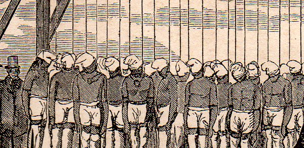 The detail of the wood engraving that I've shown above may have these men shirtless in the bitter cold. They were being watched by men in columns, at attention. Then there were others who were standing on a barrel to get a better view. Others were on horseback. Outside the obvious monstrosity of the situation, not having your feet on the ground, not standing, not bothering to keep yourself erect as witness to the enormity, was inexcusably bad behavior.