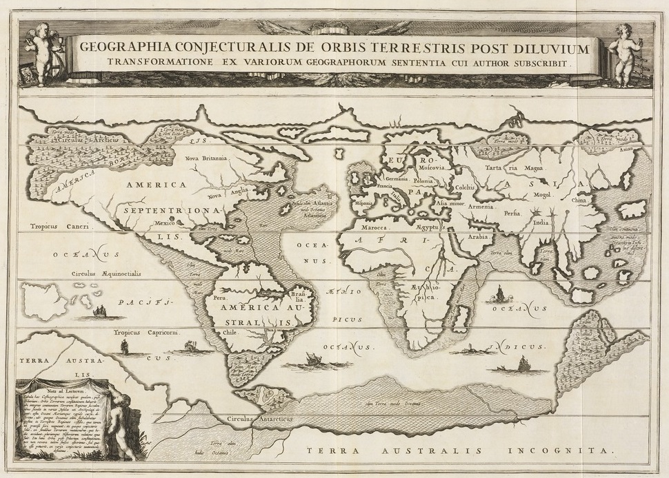 The forever-busy Athanasius Kircher made this post-flood reconsideration of the Earth, Geographia Conjecturalis de Orbis Terrestris Post Diluvium3, published in Amsterdam in 1675. Source: Getty Museum, here.]