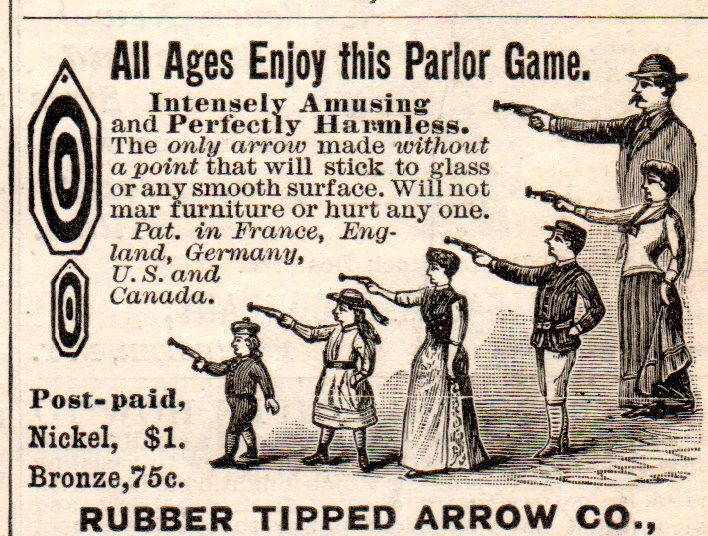 The beautifully and accurately named Rubber Tipped Arrow Company supplied an assortment of parlor games for children (and adults) for "perfectly harmless" shooting. The truth is that I really liked the image of progression of shooters, reminding me a little of the "Ages of Man" prints. This appears in the advertising section of the Scientific American for 3 August 1890--two issue before their famous cover showing Herman Hollerith's critical calculating machines at use in the American census.