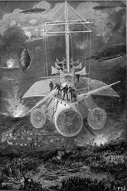 Manhattan Life Insurance Building, again in New York City which was 18 stories and 348 feet high. So the Burgess building was a big one by world standards in 1899--and of course there would be no tall structures like this without steel framing, or elevators, or for that matter fool-proof elevator emergency brakes. In any event the elevator spikes through the roof of the o'Ligg building, looking for all the world like one of the aliens from Wells' War of the Worlds, which was published a year earlier than this book, in 1898. (I should say the appearance was suggested by the first edition of Wells' 1898 book, as it was not illustrated.)