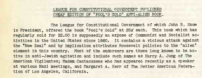 I had never heard of this League for Constitutional Government before last night, and had a difficult time making my way through its somehow dense and loosely packed four-page contents--until it dawned on me that what I was really reading was Fascist propaganda--and that was surprising, mainly because it was so early on it the history of Fascist stuff going on in America.