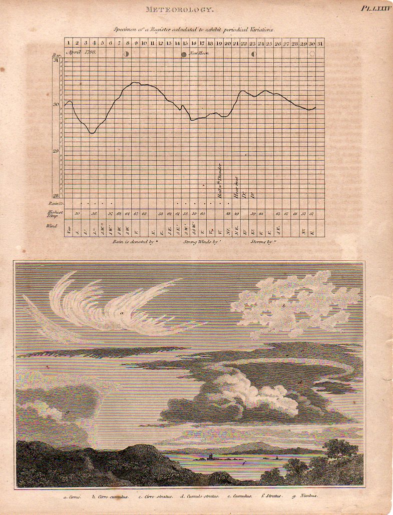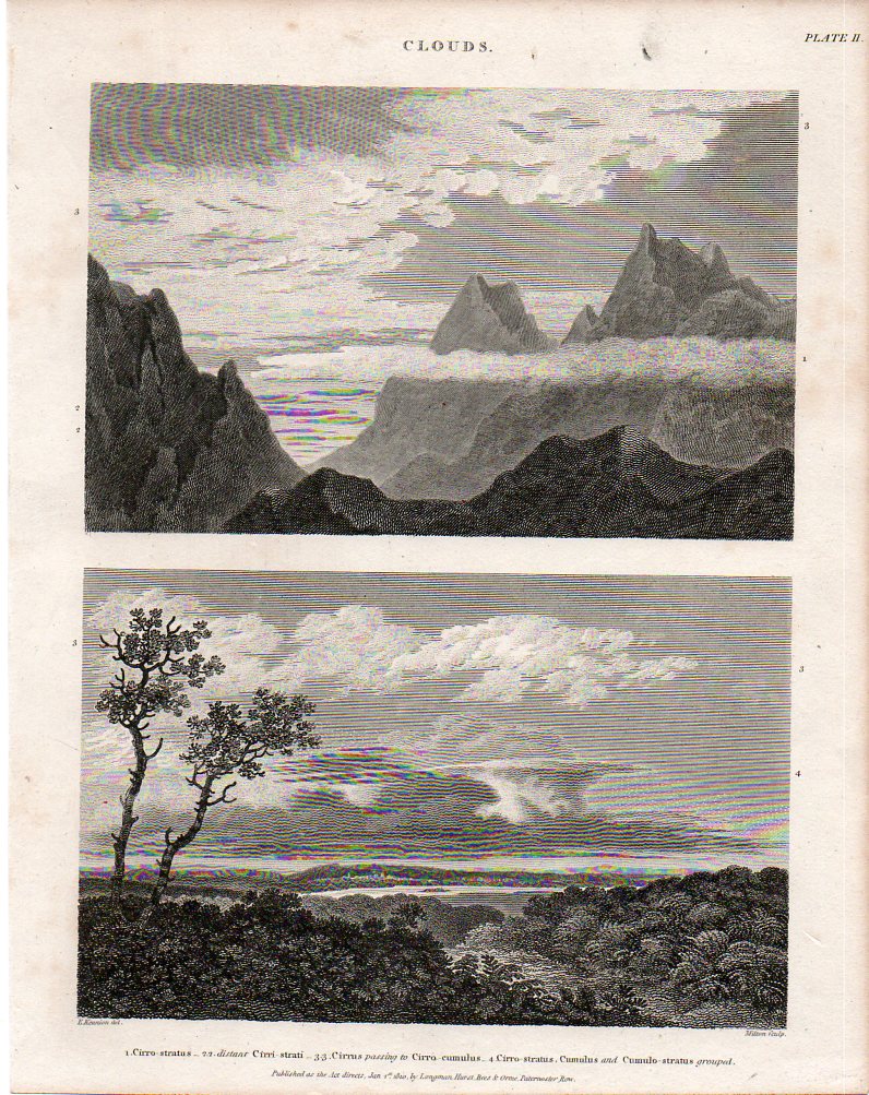 Here (below) are two fine, early examples of cloud-naming for the scientifically-minded of the British elite, finding their way into print in the fabulous, ingenious and mammoth (45-volume) Cyclopædia, or The New Cyclopaedia, or, Universal Dictionary of the Arts and Sciences, edited by Abraham Rees (1743-1825). The work was published between 1802 and 1820, and was the resulting effort of 100 contributors who generally wrote monograph-length entries, contributing to a final tally of close to 40 million words. I’ve particularly enjoyed the illustrations like those below—some of which have become iconic—and especially the fine and deep engraving of Wilson Lowry.