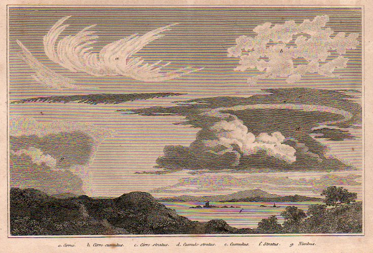 It was the English pharmacist and chemist Luke Howard who in 1803 gave a greater bit of thought to structuring cloud names, classifying them according to size and shape and giving them Latin names—and this forms the basis of our naming clouds to this day. Howard was perhaps the first, greatest, meteorologist, producing On the Modification of Clouds, (in which he describes his naming system, the “modification” part actually meaning classifying rather than changing), The Climate of London, and the first textbook on weather, Seven Lectures on Meteorology. Howard’s system was expanded in 1887 by Abercromby and Hildebrandsson, who further classified clouds by height above ground as well as by appearance (and utilizing Howard’s naming system).