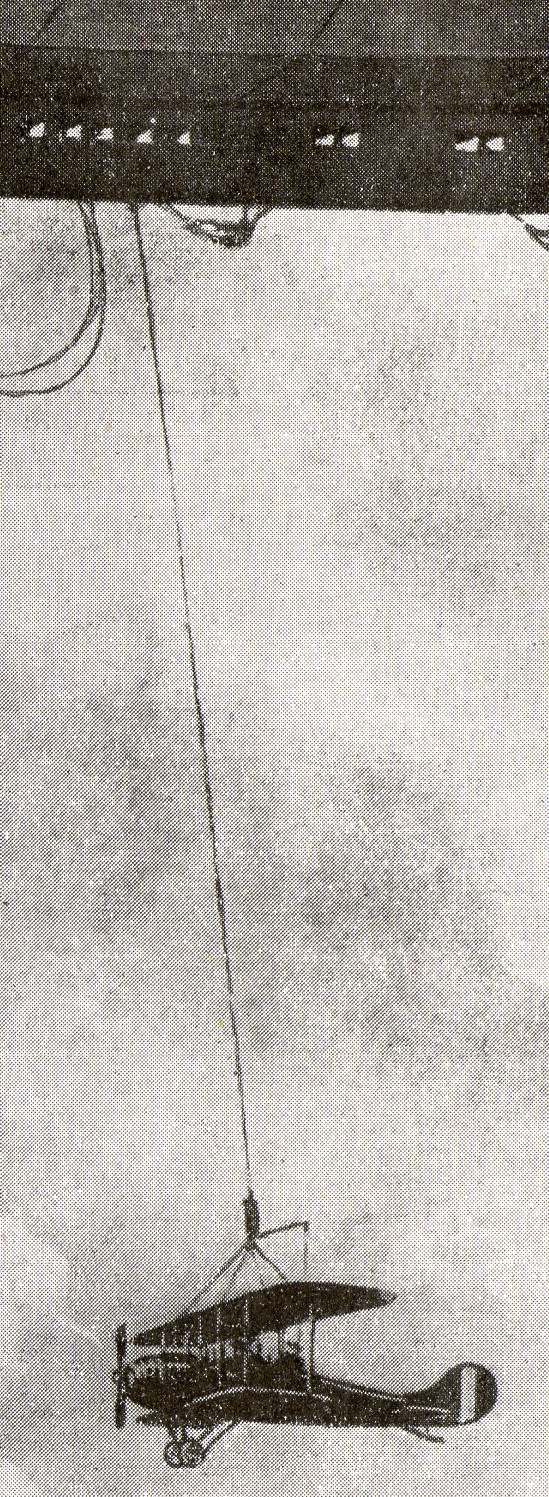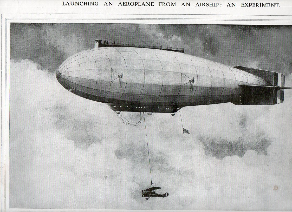 The second image appears in The Illustrated London News for 1 March 1919 and is entitled "Launching an Aeroplane from an Airship, an Experiment", and shows a helium-filled airship ("of the near future") about to drop an aircraft. The airship would have risen to some height with the aircraft already at tether, travelled a distance far beyond the normal range of the airplane-in-tow, and then release it--after a fall of a thousnad feet or so, the engines would start, and the plane would be operational. that was one way of advancing air cover far beyond what woul dhave normally been feasible.