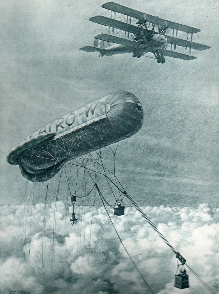 The first is "The Clapham Junction of the Air, a Cloudland Signal-box", seen in The Illustrated London News for 15 March 1919. The idea was simple--cloud cover prevented aircraft from seeing their objective (lacking RADAR, which wouldn't appear for another 23 years) and so something needed to be done to communicate with them above the clouds to relay data on ground conditions. And so we have the tethered kite balloon with a mobile travelling car, the man in which would relate the necressary info to the waiting aricraft above. (The description of the image notes that the aircraft is "one of a coming type".)