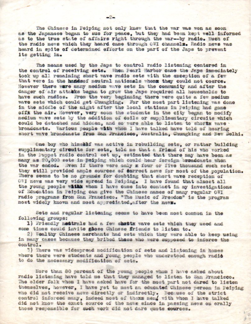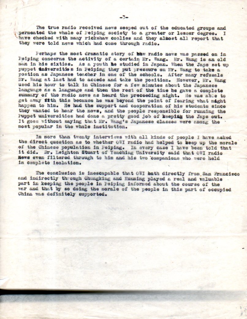 - "Report on the Effect of OWI'S Radio Program on Public Moral in Peiping During the Period of Japanese Occupation", written by George F. Winfield (November 12, 1945) . 3 carbon typed sheets, 1945. Very good copy. SOLD