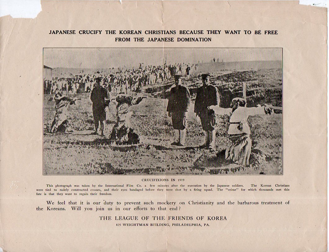 The Object of the League of the Friends of Korea. Single sheet printed on one side only (below), accompanied by another sheet, again printed on one side, "Japanese Crucify the Korean Christians Because They Want to be Free from the Japanese Domination", again, printed on one side only (also illustrated below). Both with old folds, somewhat tatty. That said, these are quite uncommon. The first document is hand-annotated on the reverse "Mrs. H.J.(?) Highton (?) King, July 21, '19", which would place this publication at about a month following the Friends of Korea founding in Philadelphia in June 1919. Provenance, the Library of Congress. WorldCat locates zero copies. SOLD