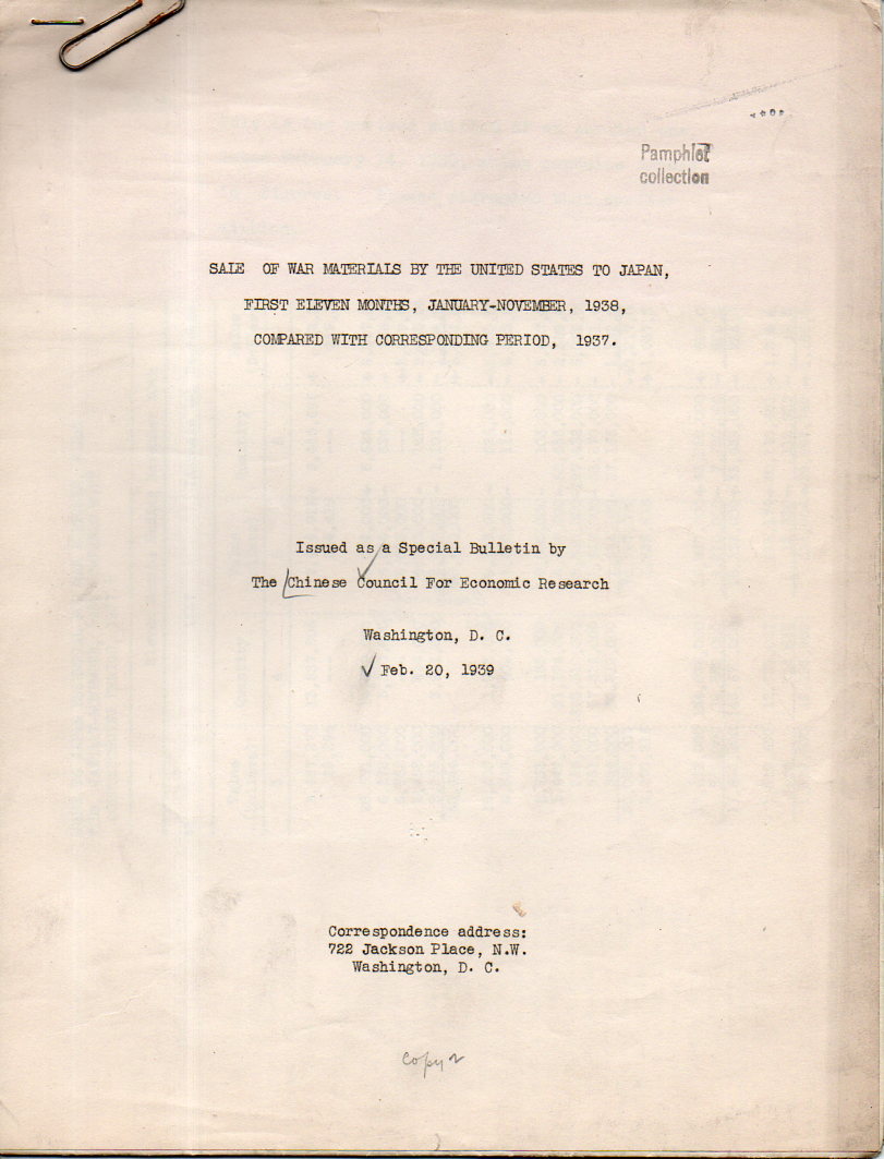 Sale of War Materials by the United States to Japan, First Eleven Months, January-November, 1938, Compared with Corresponding Period, 1937. "Issued as a Special Bulletin by the Chinese Council for Economic Research", issued February 20, 1939, and published in Washngton D.C. 11x8, 4pp, plus two folding tables. ALSO: another version of this work, same pagination, same folding tables, though the text varies somewhat. Both offset printed. From the Library of Congress Pamphlet Collection. SOLD