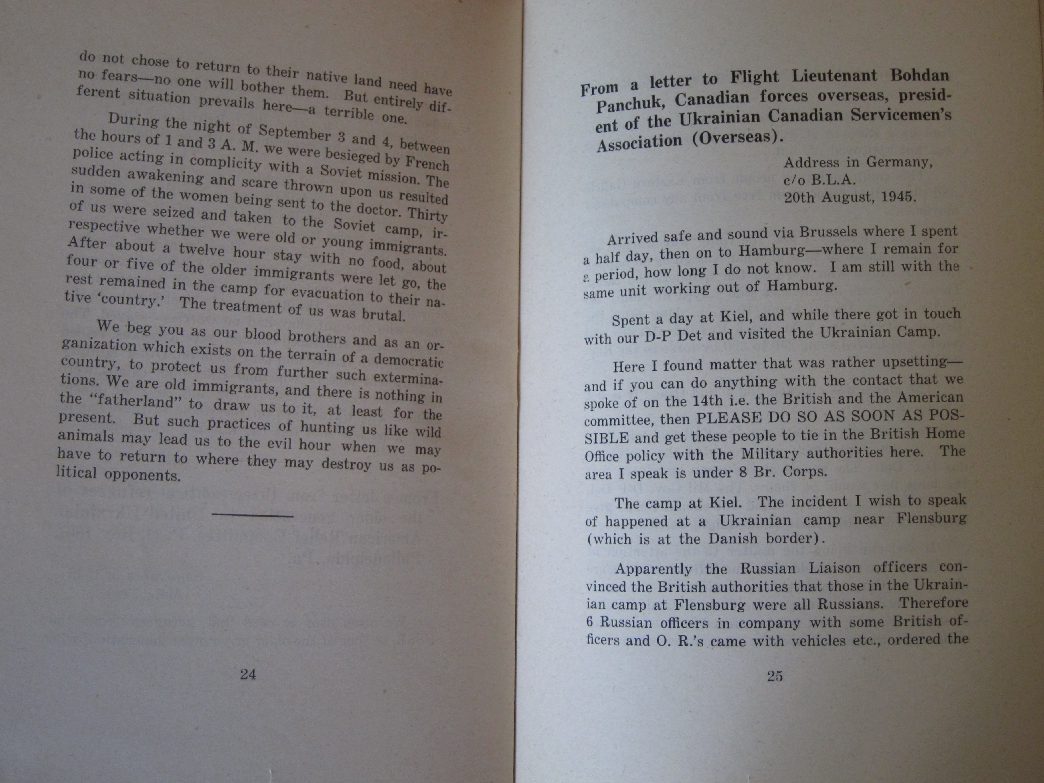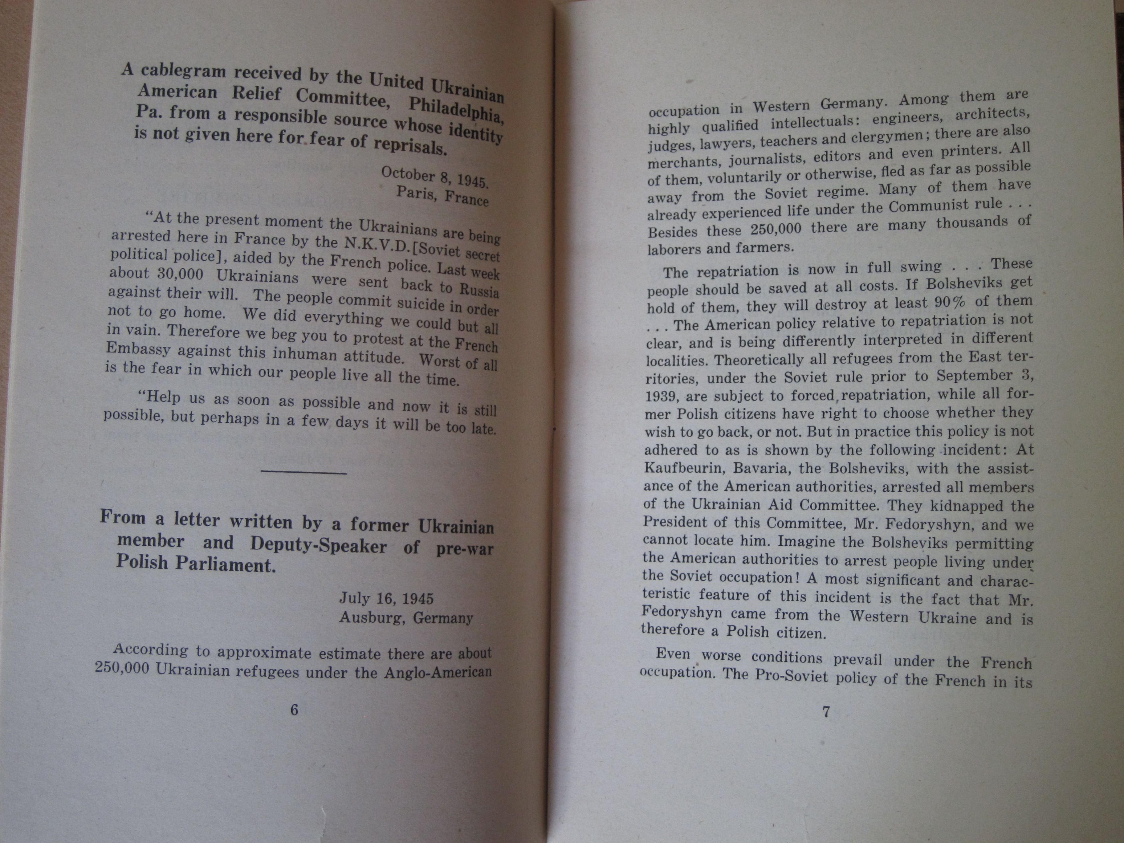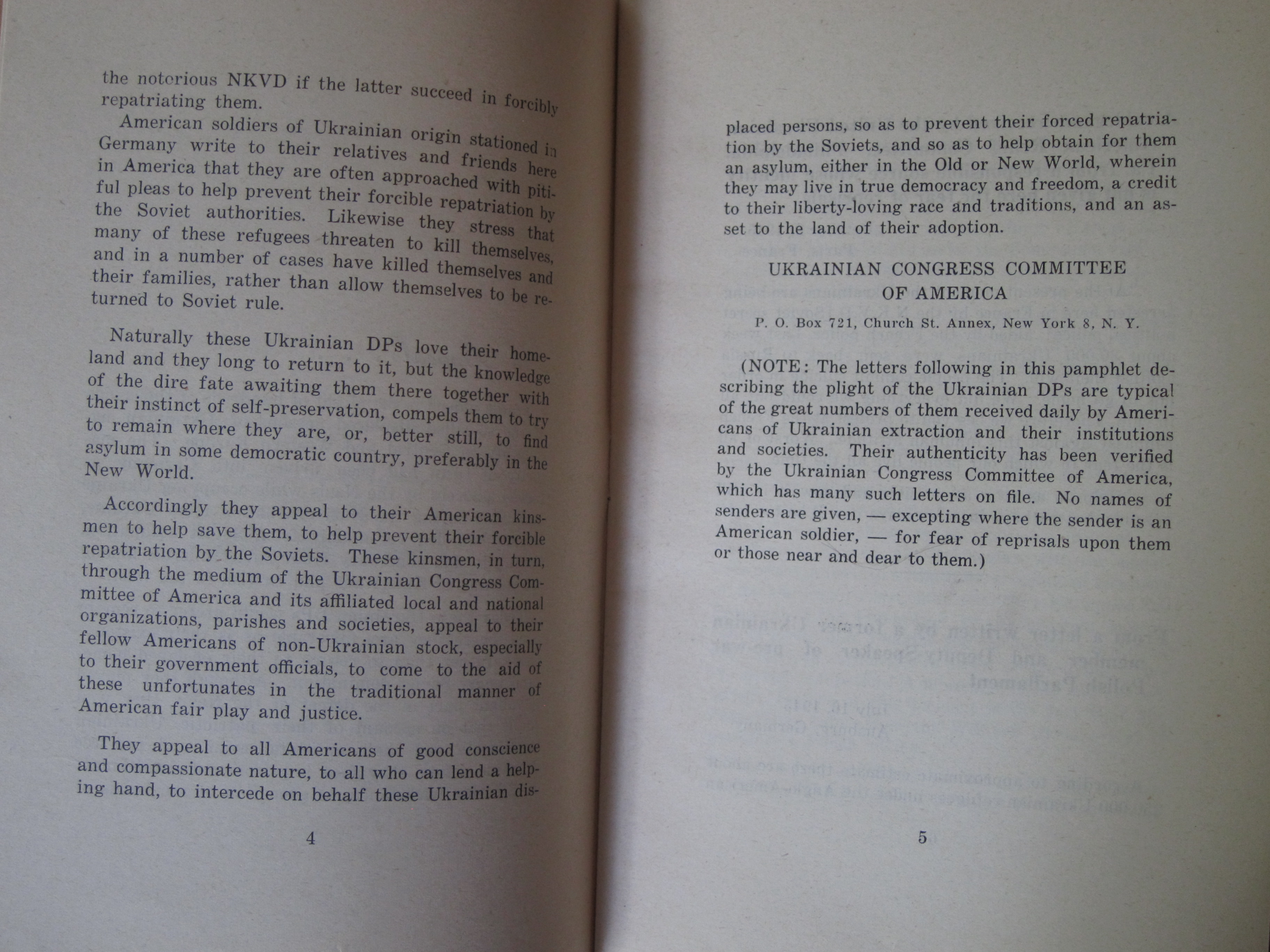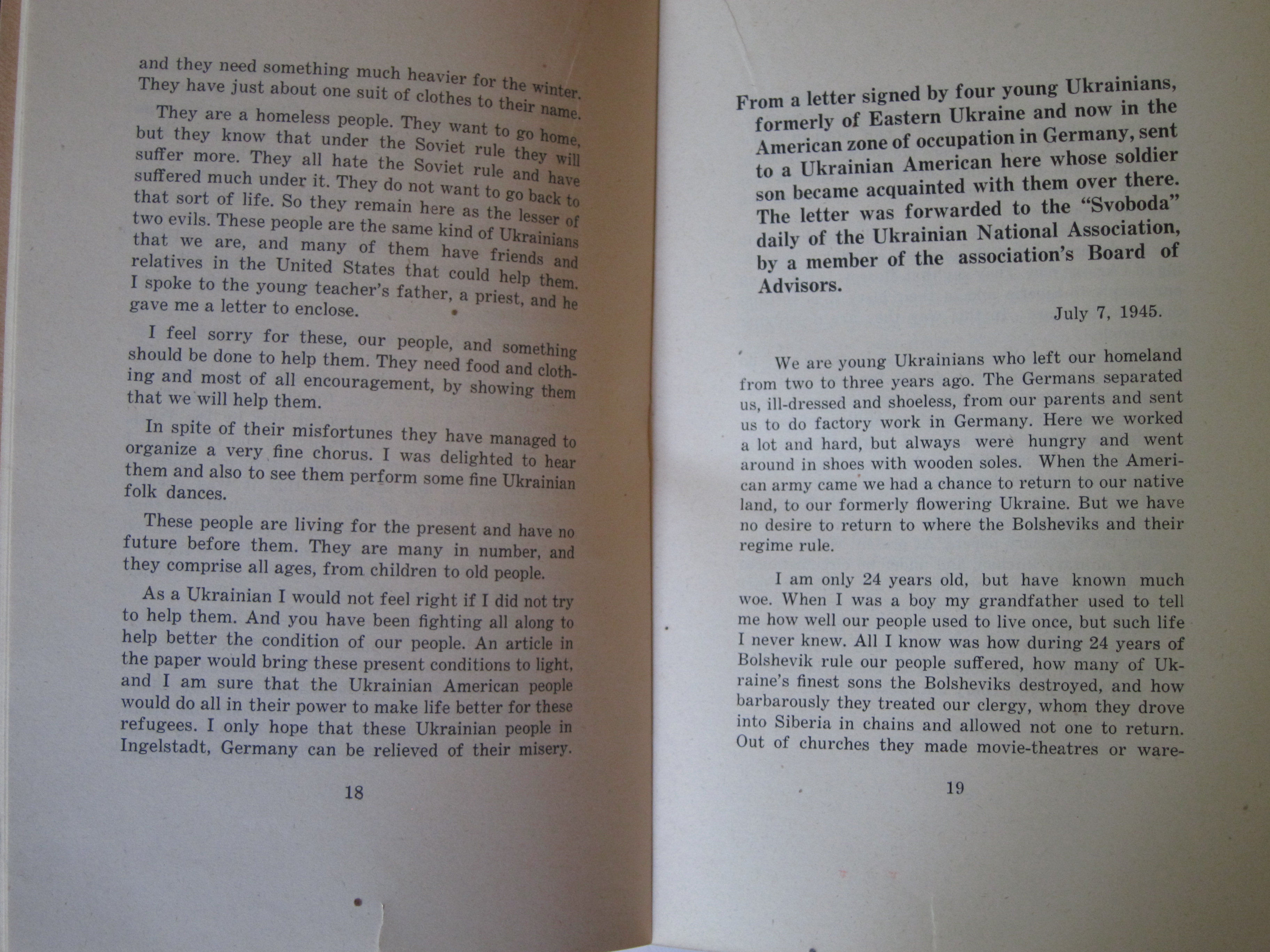 I've reprinted the full text below. (Plight of Ukrainian DPs : a few typical letters of many being received daily from Europe describing the tragic plight of Ukrainian displaced persons whom the Soviets would forcibly repatriate and doom to enslavement, persecution or death, ca. 1945/6, or 1945 according to WorldCat/OCLC.)
