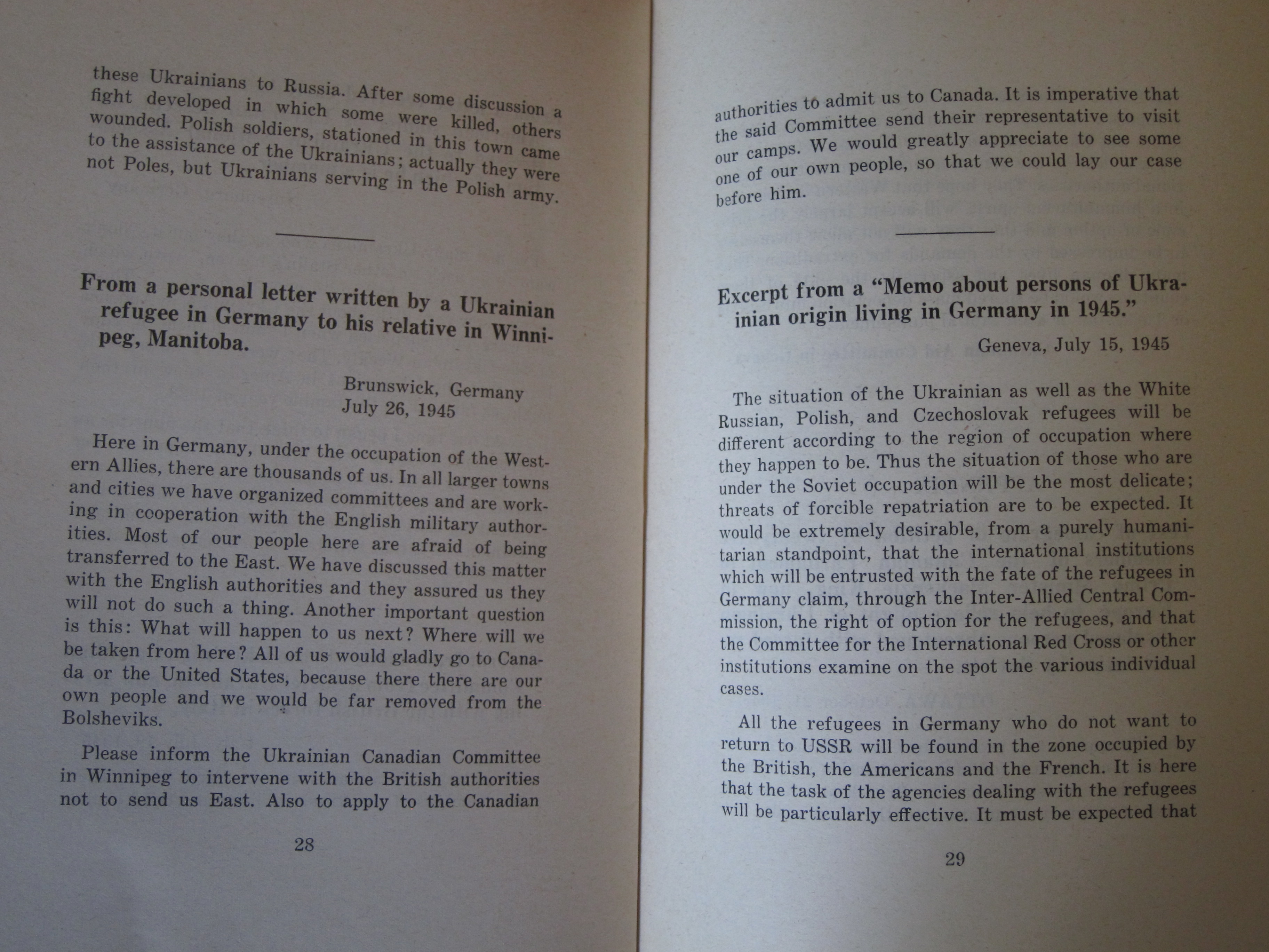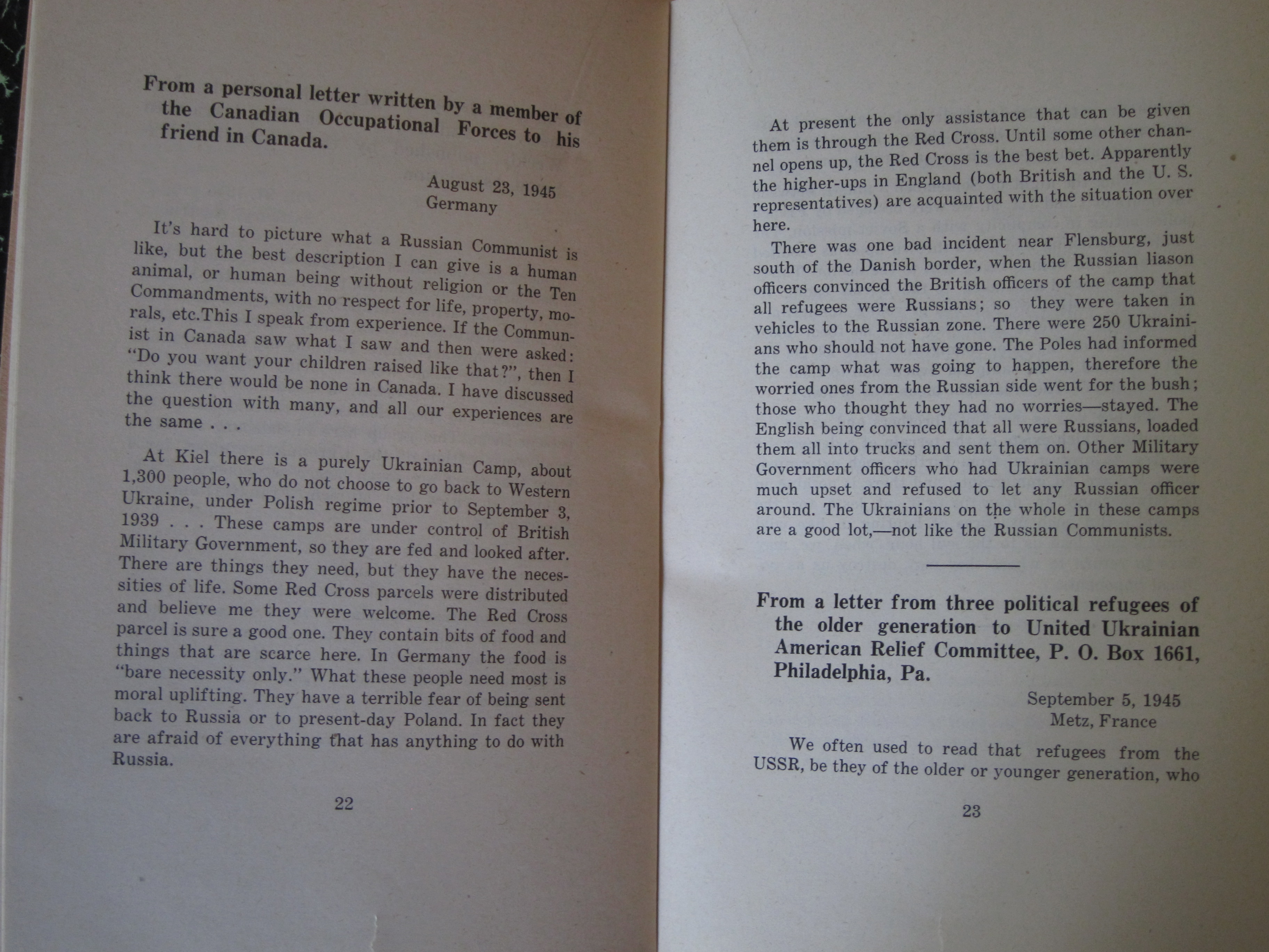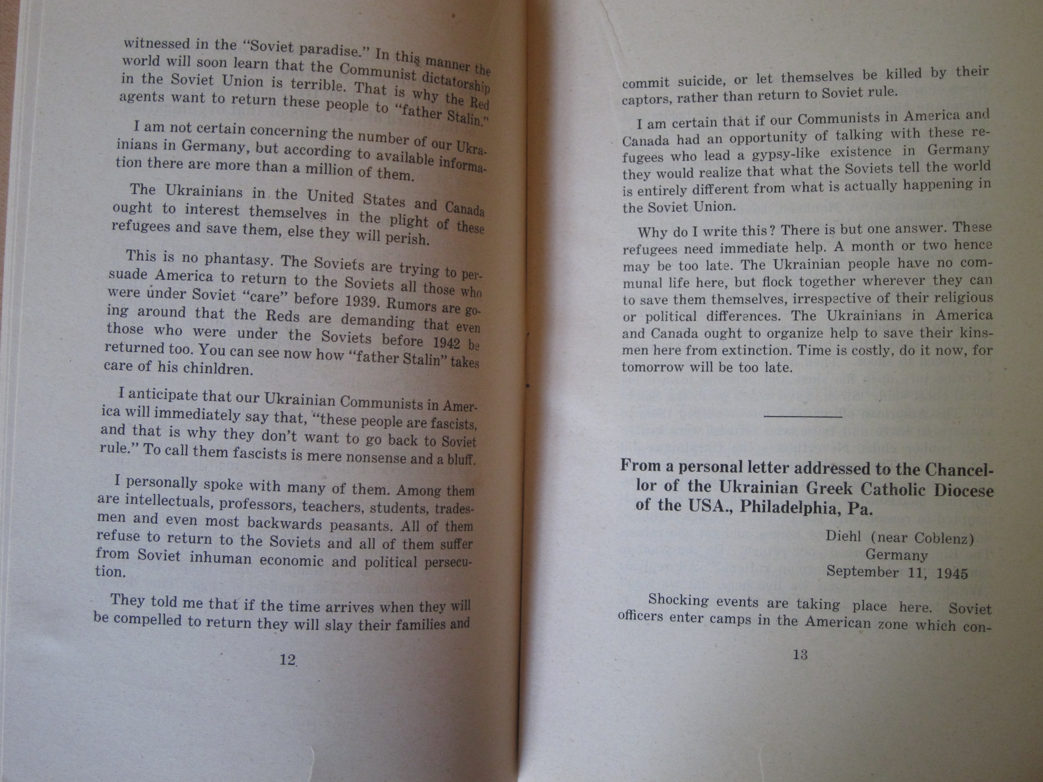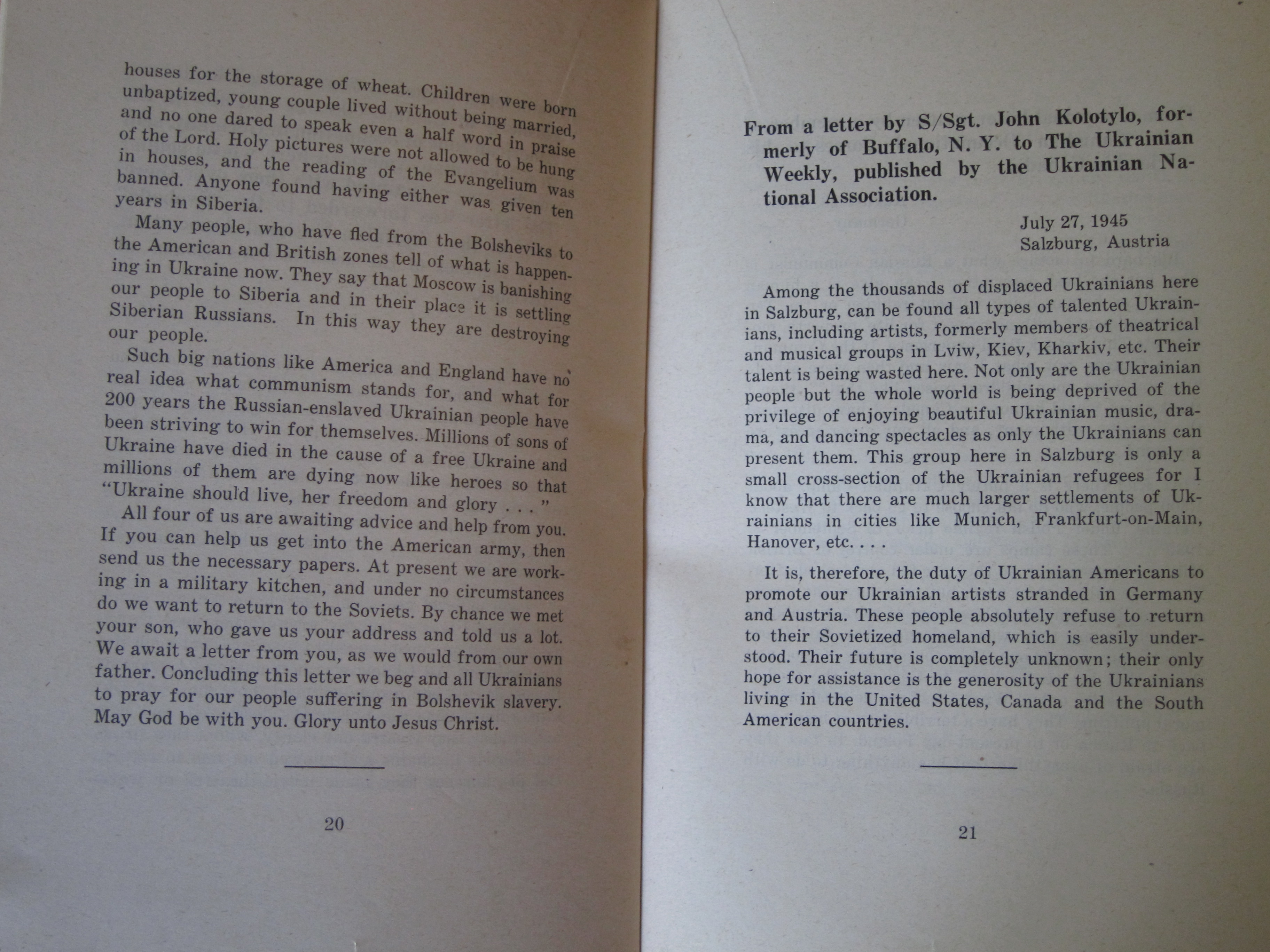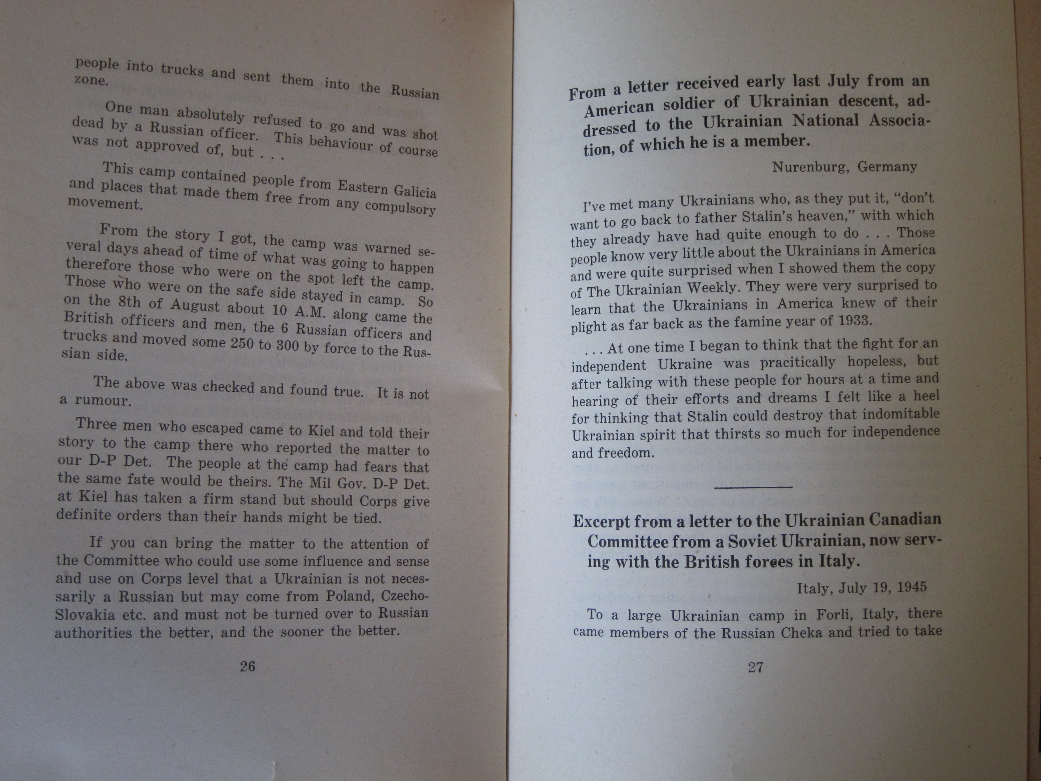 I've reprinted the full text below. (Plight of Ukrainian DPs : a few typical letters of many being received daily from Europe describing the tragic plight of Ukrainian displaced persons whom the Soviets would forcibly repatriate and doom to enslavement, persecution or death, ca. 1945/6, or 1945 according to WorldCat/OCLC.)