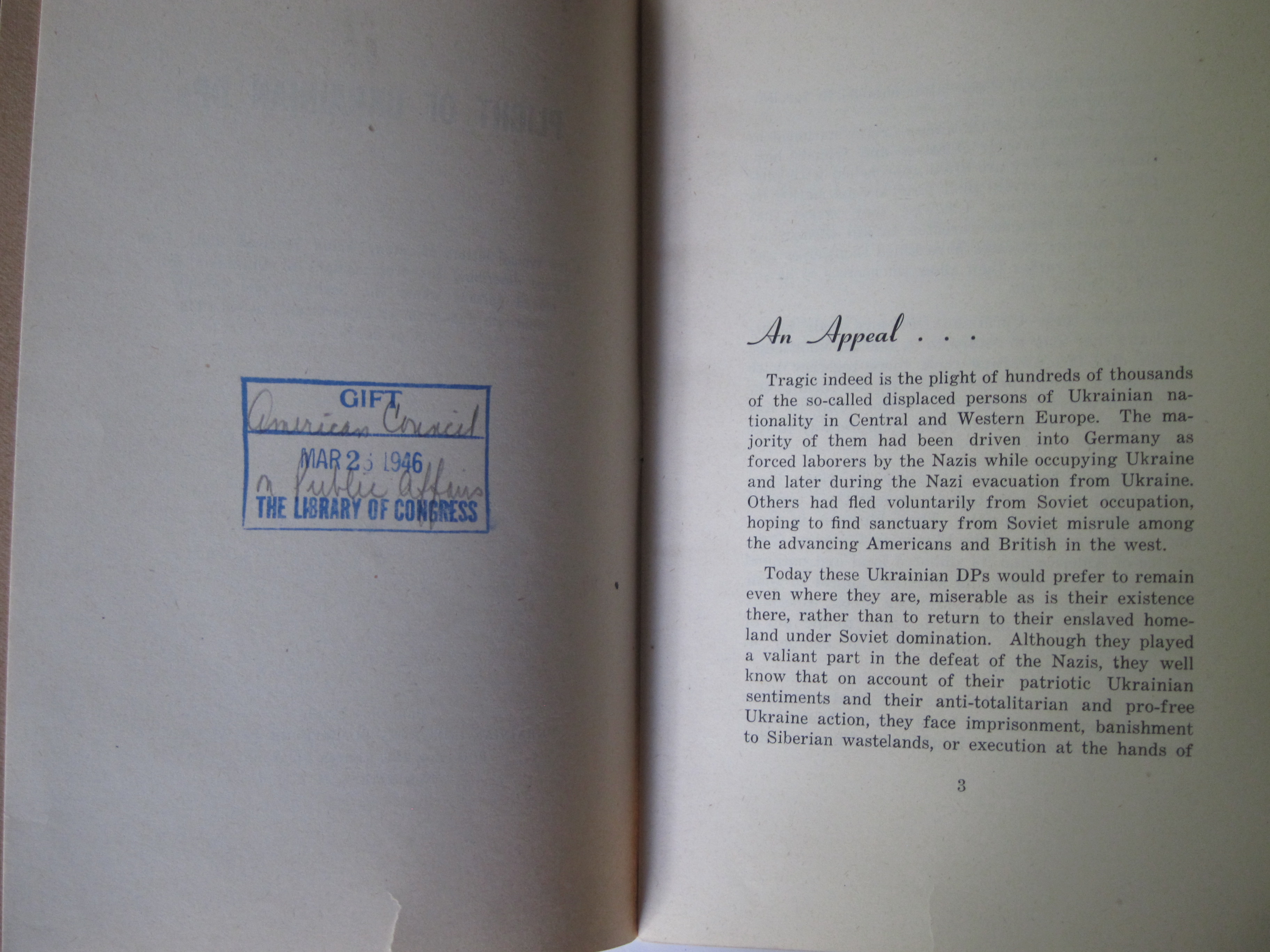 Plight of Ukrainian DPs : a few typical letters of many being received daily from Europe describing the tragic plight of Ukrainian displaced persons whom the Soviets would forcibly repatriate and doom to enslavement, persecution or death. Ukrainian Congress Committee of America, New York City, 1945/6. 21.5x14 cm, 29pp. Provenance: Library of Congress, with their surplus stamp on the rear cover. Scarce publication, with 11 copies found in the WorldCat/OCLC. Wrappers. There is a 1-inch tear at the middle-bottom on each page. SOLD