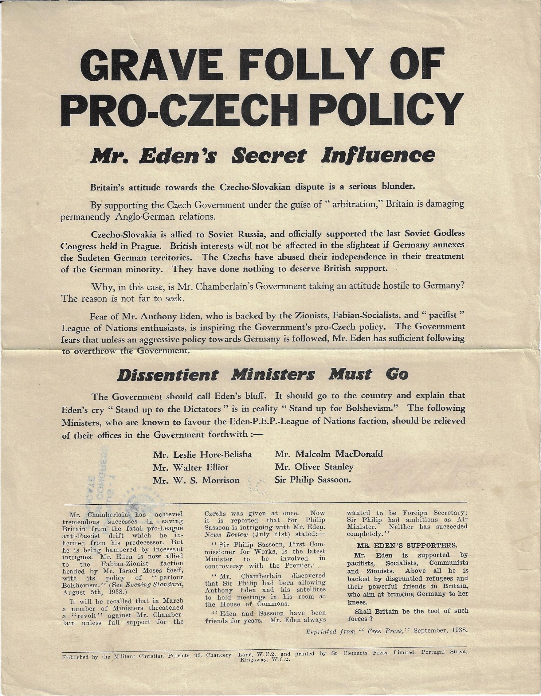 Grave Folly of Pro-Czech Policy, Mr. Eden's Secret Influence. London: Militant Christian Patriots, 1938.