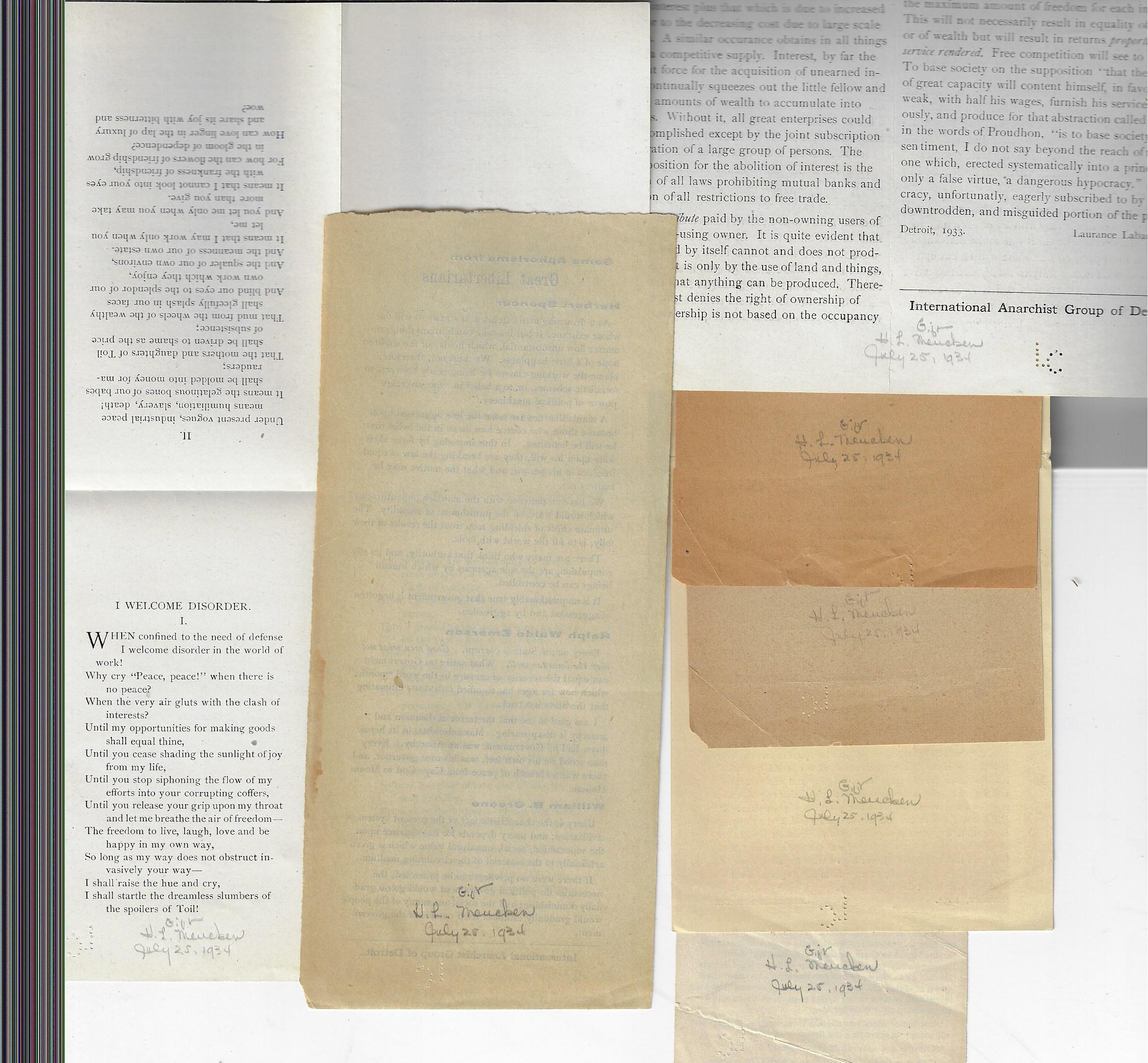 Jo. Labadie, "I Welcome Disorder", Detroit, 1933. 127x80mm, 6pp, from one folded sheet of paper. International Anarchist Group.