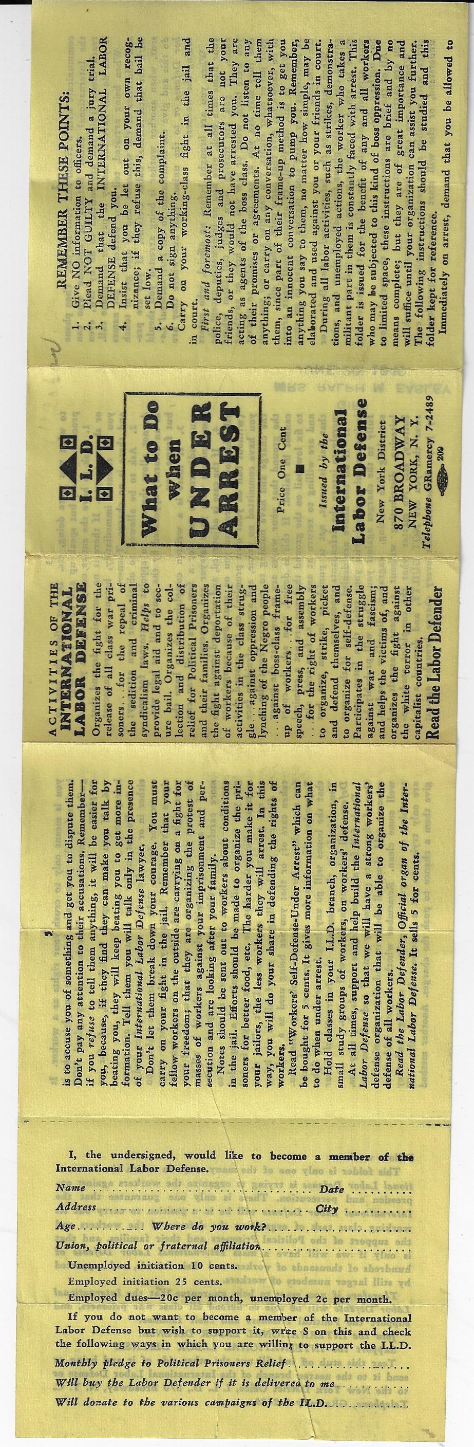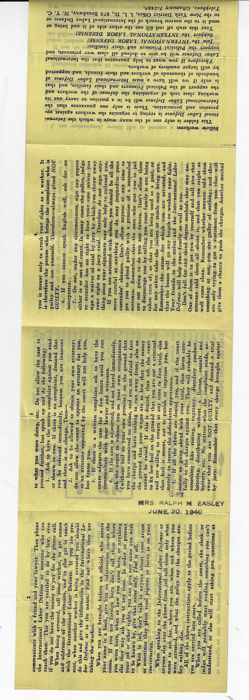 “What to Do when Under Arrest” pamphlet, distributed/sold for a penny, by the International Labor Defense. 4.25x1.75”, folded from a 14x4.25” sheet, printed on two sides, in 8 panels. I guess it was made to fit into a wallet. Provenance: estate of Ralph M. Easley. Very Fine condition. No date of publication, but ca. 1938/9, with a gift stamp of 1940