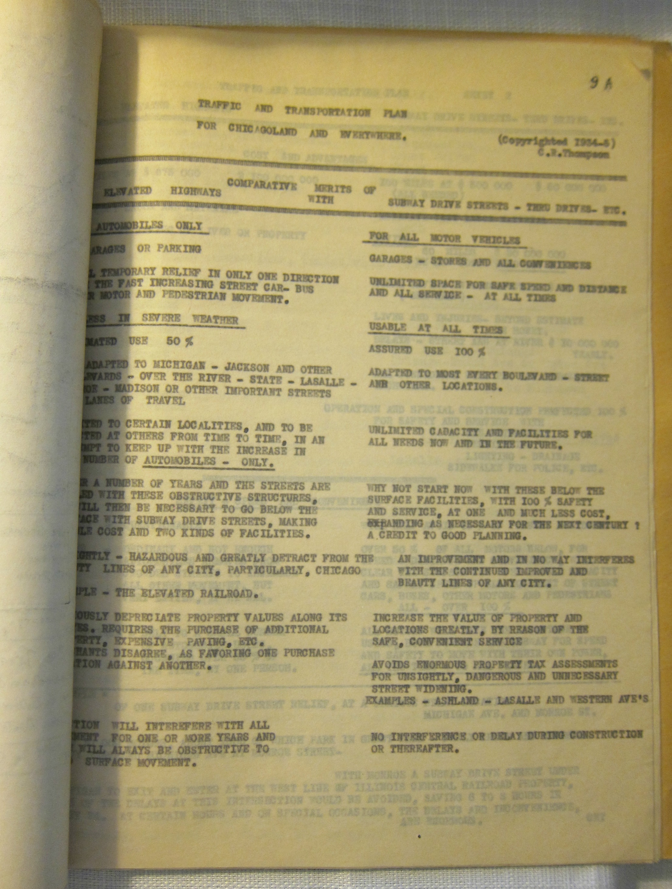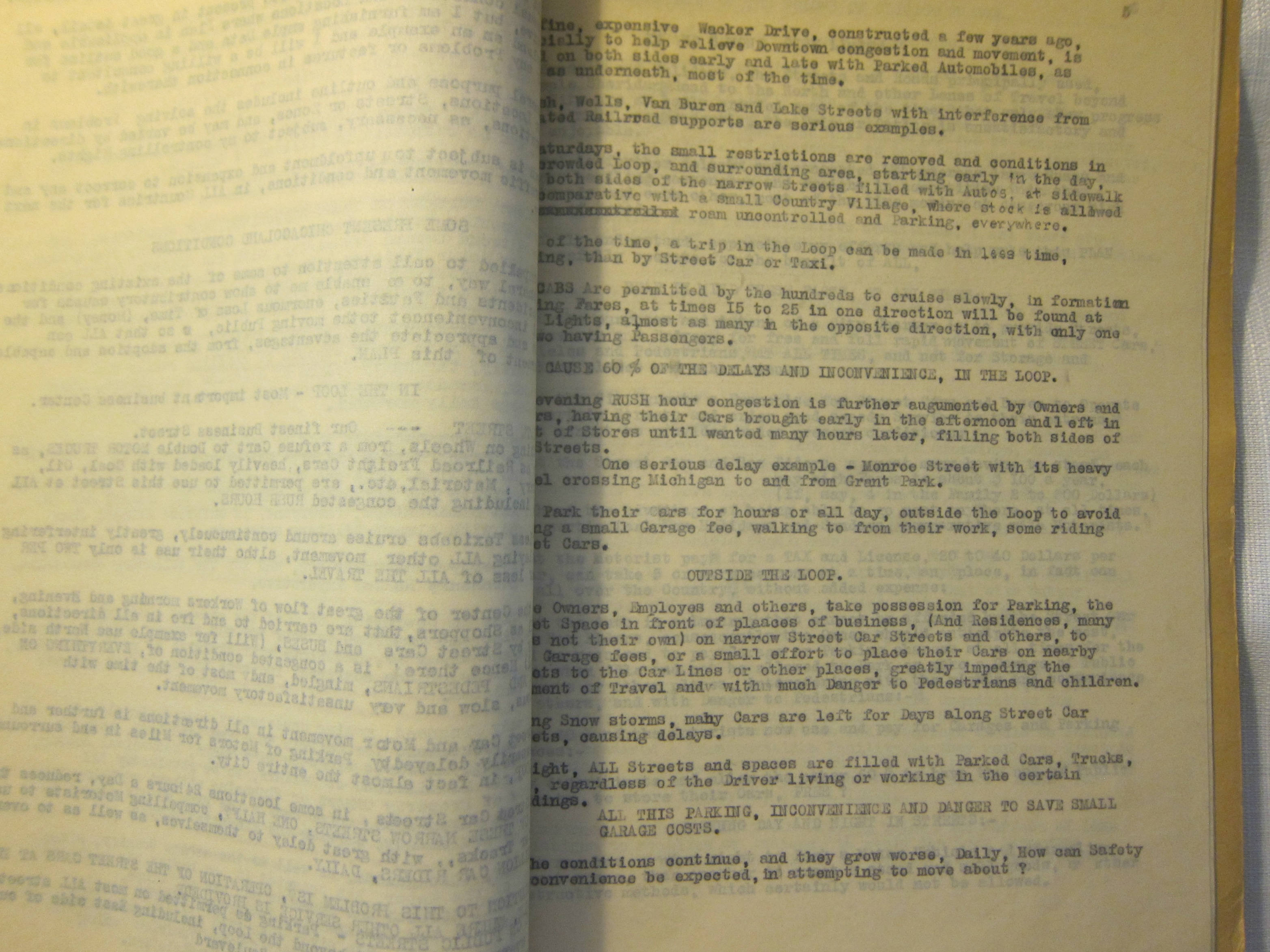Mr. Thompson starts his effort by reviewing the traffic accidents and deaths in the U.S. and Chicagoland (which were very high per capita compared to now). He also records streetcar fatalities, which for Chicago was more than one per day in 1934, which seems like an enormous figure. In any event he reviews the situation and proposes taxicab-less avenues, restricted parking, traffic tunnels, parking garages, and such, as a solution. Some of the ideas by this private citizen sound good, others not so.