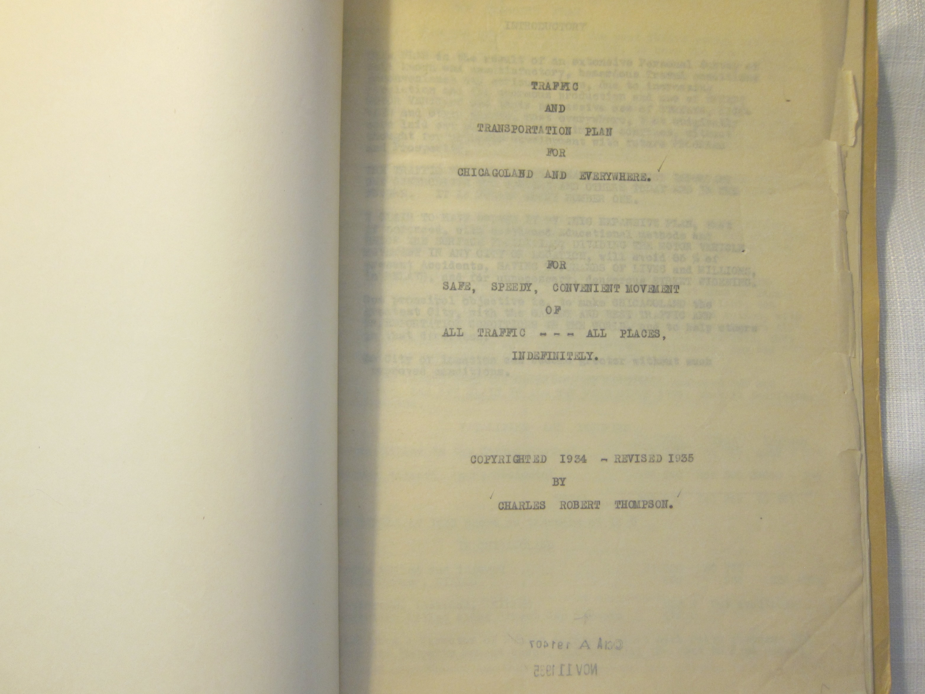 Carbon copy on onionskin-like paper. This is a carbon copy from the typed original of one man's answer to the traffic problems of Chicago. I'm fairly certain that this is a private effort and was never published. There are no copies in WorldCat/OCLC, and the only internet listing is for the copyright notice. Provenance: the Library of Congress Pamphlet Collections; there are some routing/accession numbers and a date from the copyright office on the back of the copyright page (No 11, 1935), and a LC surplus/duplicate rubber stamp on the rear cover. Bound in a period two-punch manila folder with hand-lettered title on front cover. In VERY GOOD condition.SOLD